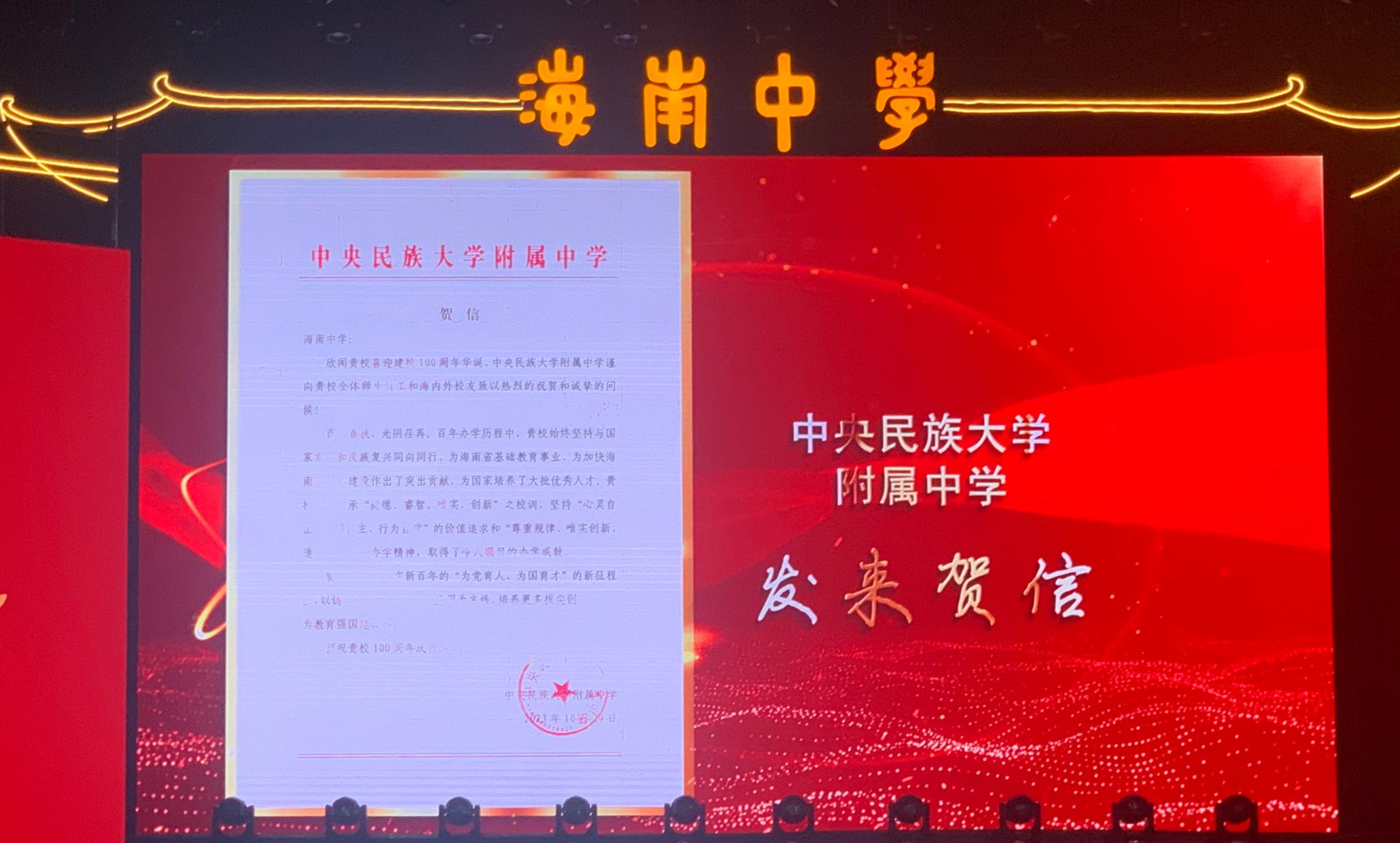 校庆现场播放的我校致海南中学建校100周年的贺信