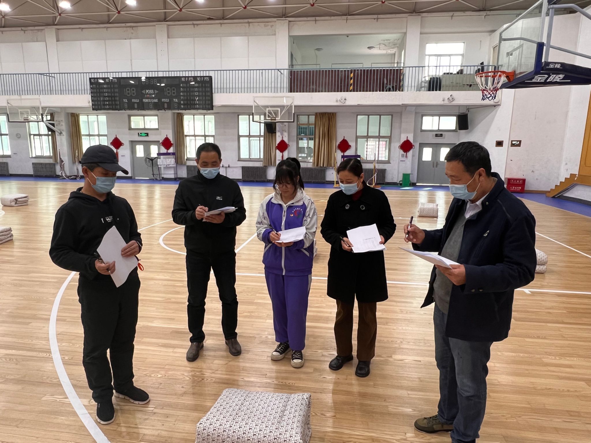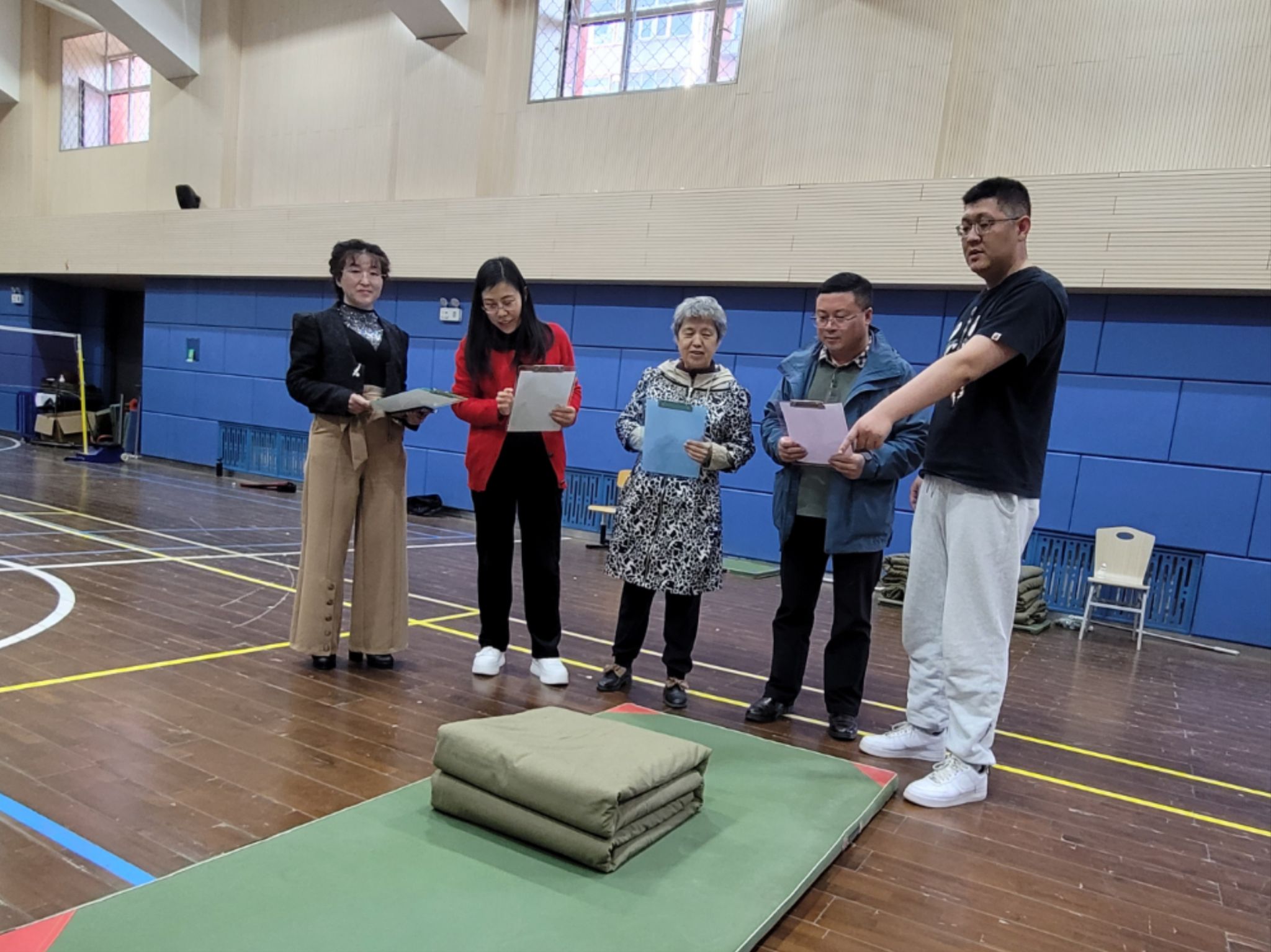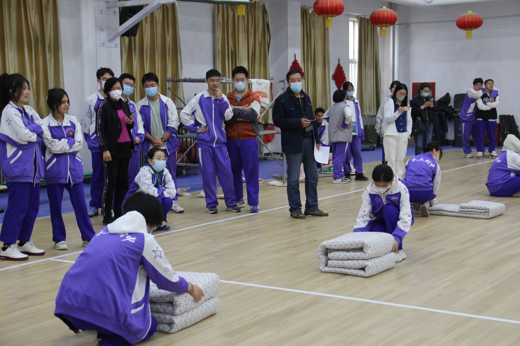参赛学生在规定时间内叠好被子后,信心满满地站在被子旁等待评委打分。看到同学们叠得整整齐齐的被子,各评委们纷纷给予好评。