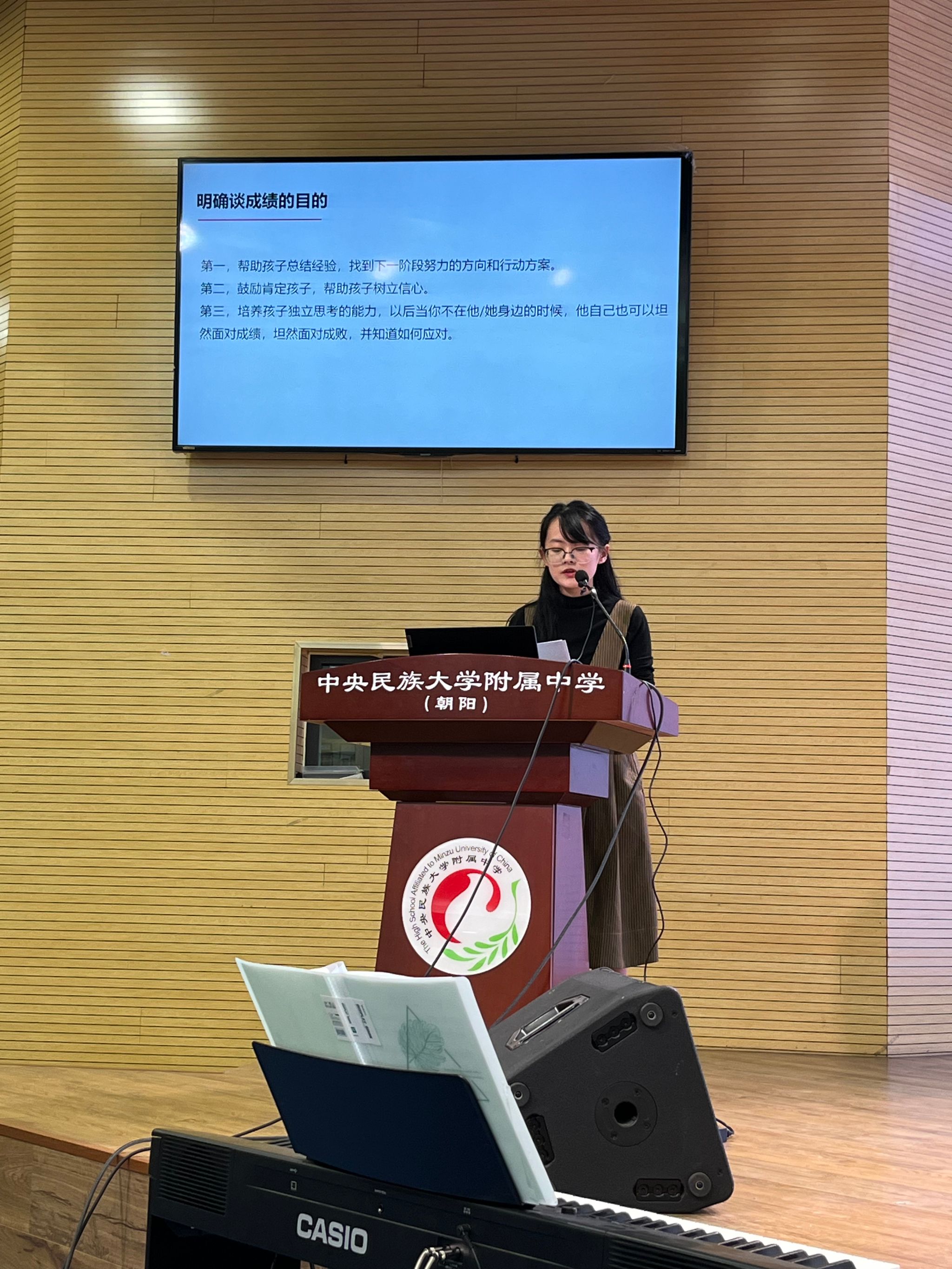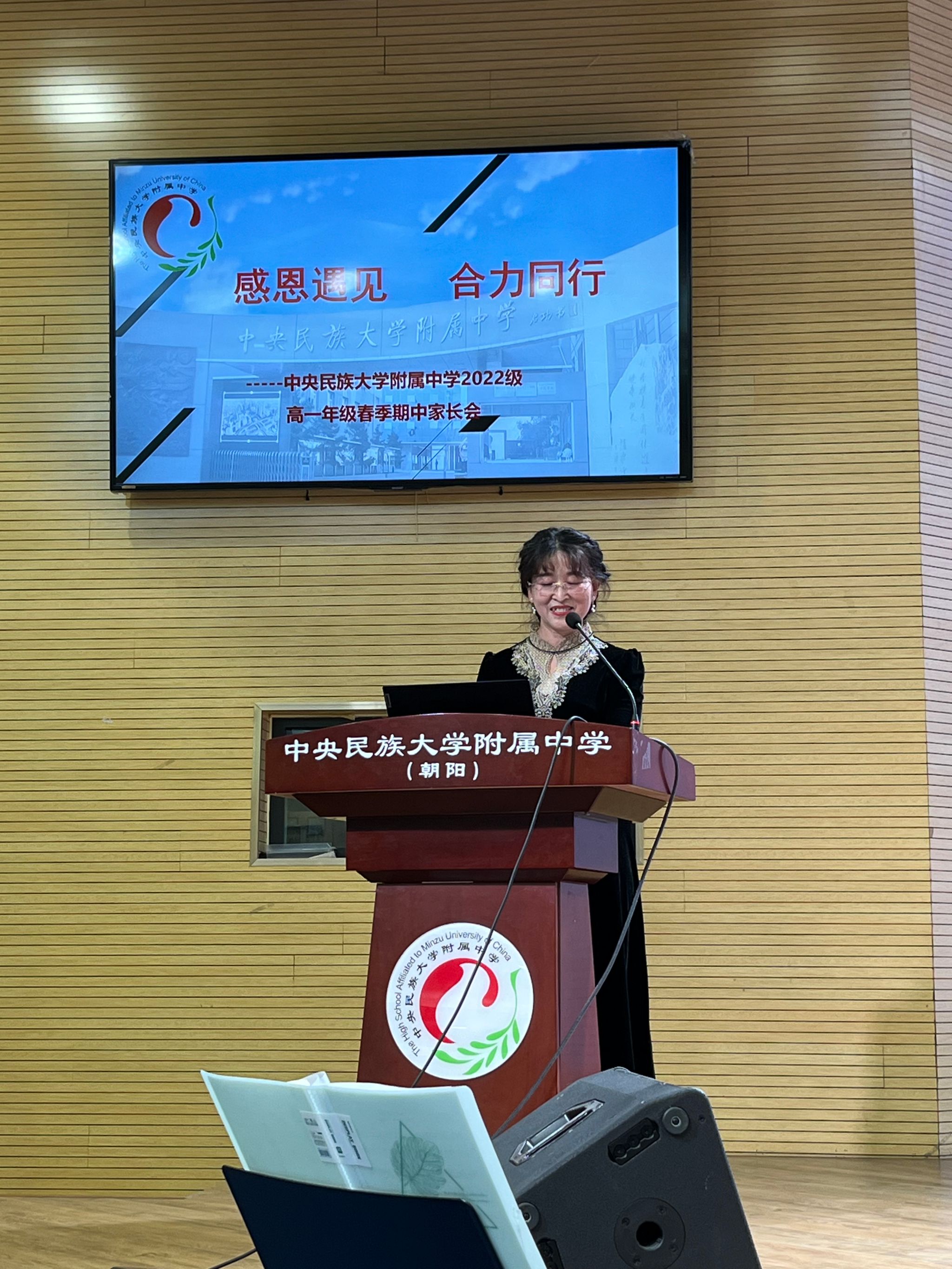 高一年级主任朱秀荣作了题为《感恩遇见 合力同行》的报告。朱主任从“学校基本概况” “期中成绩分析”“工作总结”“后期安排”“给家长的建议”等五个方面向家长们作了详实的汇报。朱主任的发言深挚恳切,既向家长展示了孩子们入学九个月来的成长,也向家长们展示了民大附中所有领导、班主任、任课教师们对孩子们的关心、关爱。朱主任的发言赢得了家长们的热烈的掌声,也赢得了家长们对学校的信任和理解。