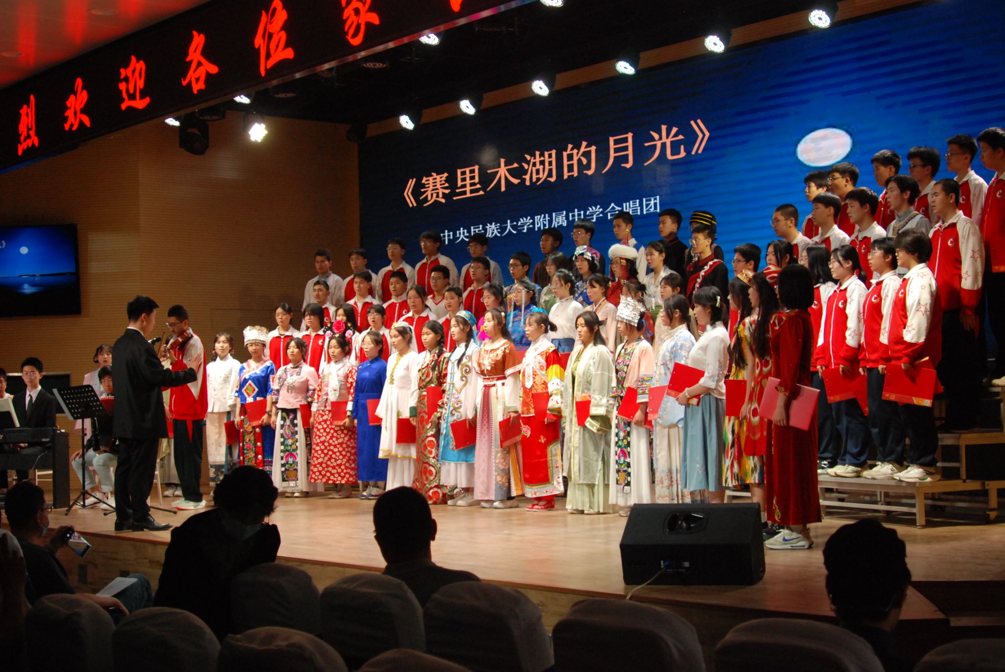 家长会上,学校合唱团的同学们演唱了《赛里木湖的月光》,大家在舞台上尽情展示青春的风貌,展现了学校铸牢中华民族共同体意识的教育成果,体现了我校“各美其美、美美与共”的教育理念。