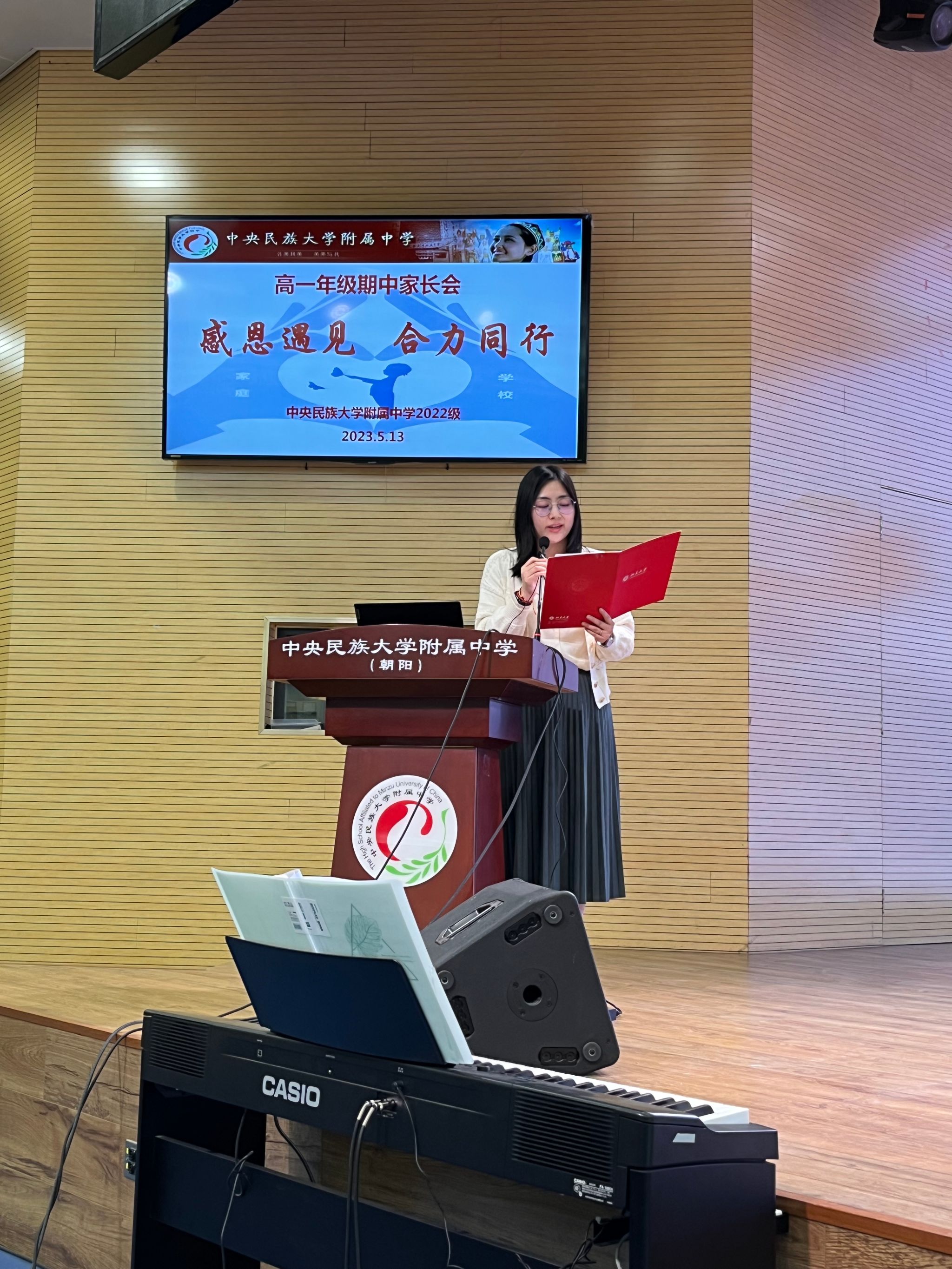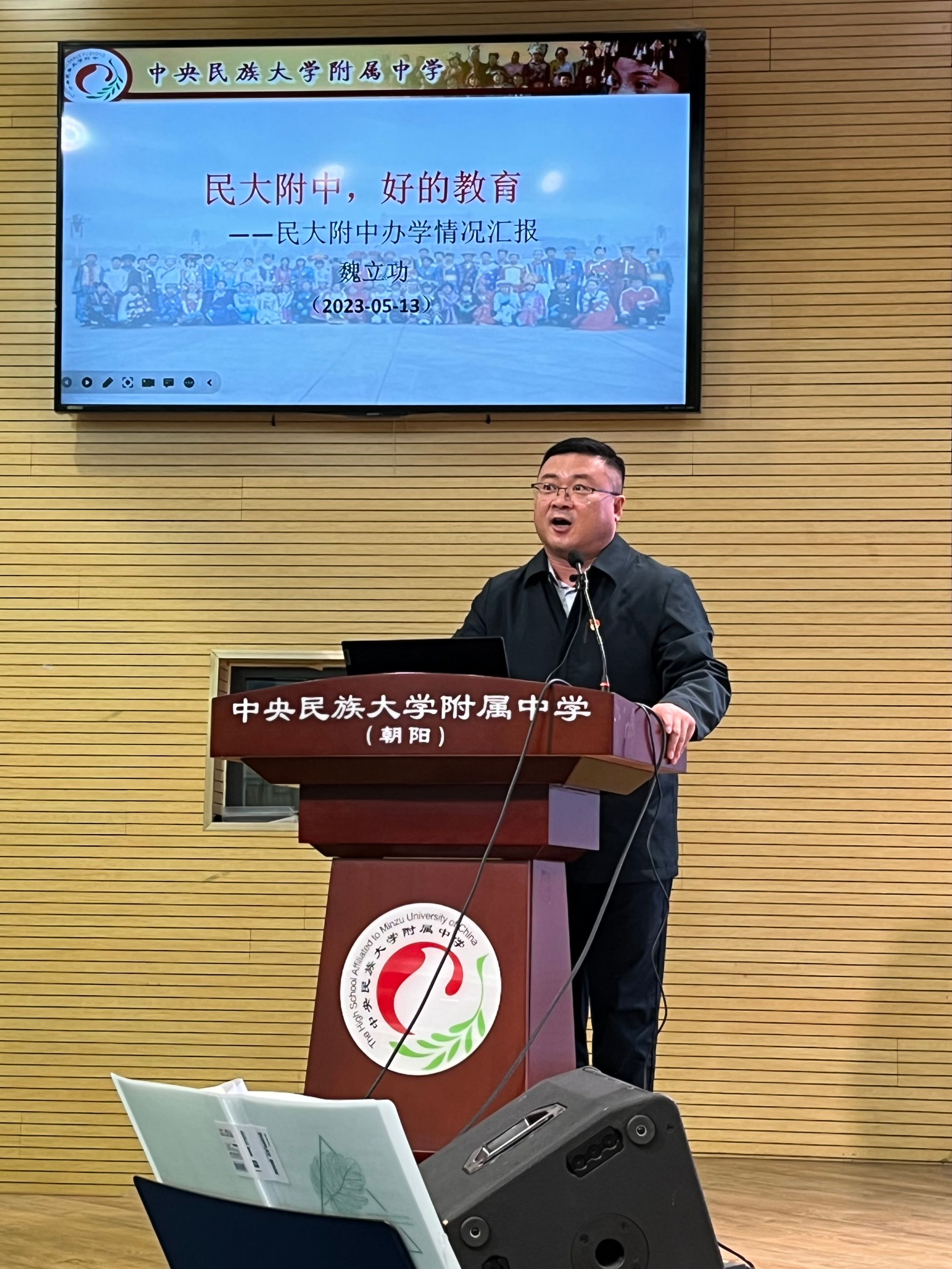 魏立功副校长在讲话中感谢家长对学校办学的信任、帮助和支持。他表示,2023年是民大附中建校110周年,十年前,建校100周年之际,习近平总书记给民大附中全体学生回信,鼓舞勉励民附学子,希望同学们努力成为建设伟大祖国、建设美丽家乡的有用之才、栋梁之材,为促进民族团结进步、实现共同繁荣发展作出应有贡献。十年来,民大附中按照总书记回信精神指引,坚持为党育人、为国育才,落实立德树人根本任务,走集团化办学发展之路,把优质教育办在老百姓家门口,培养出了一批又一批的优秀学生。魏副校长还向家长们介绍了学校红色历史、教师队伍、办学特色、办学成就,令家长们倍感振奋。