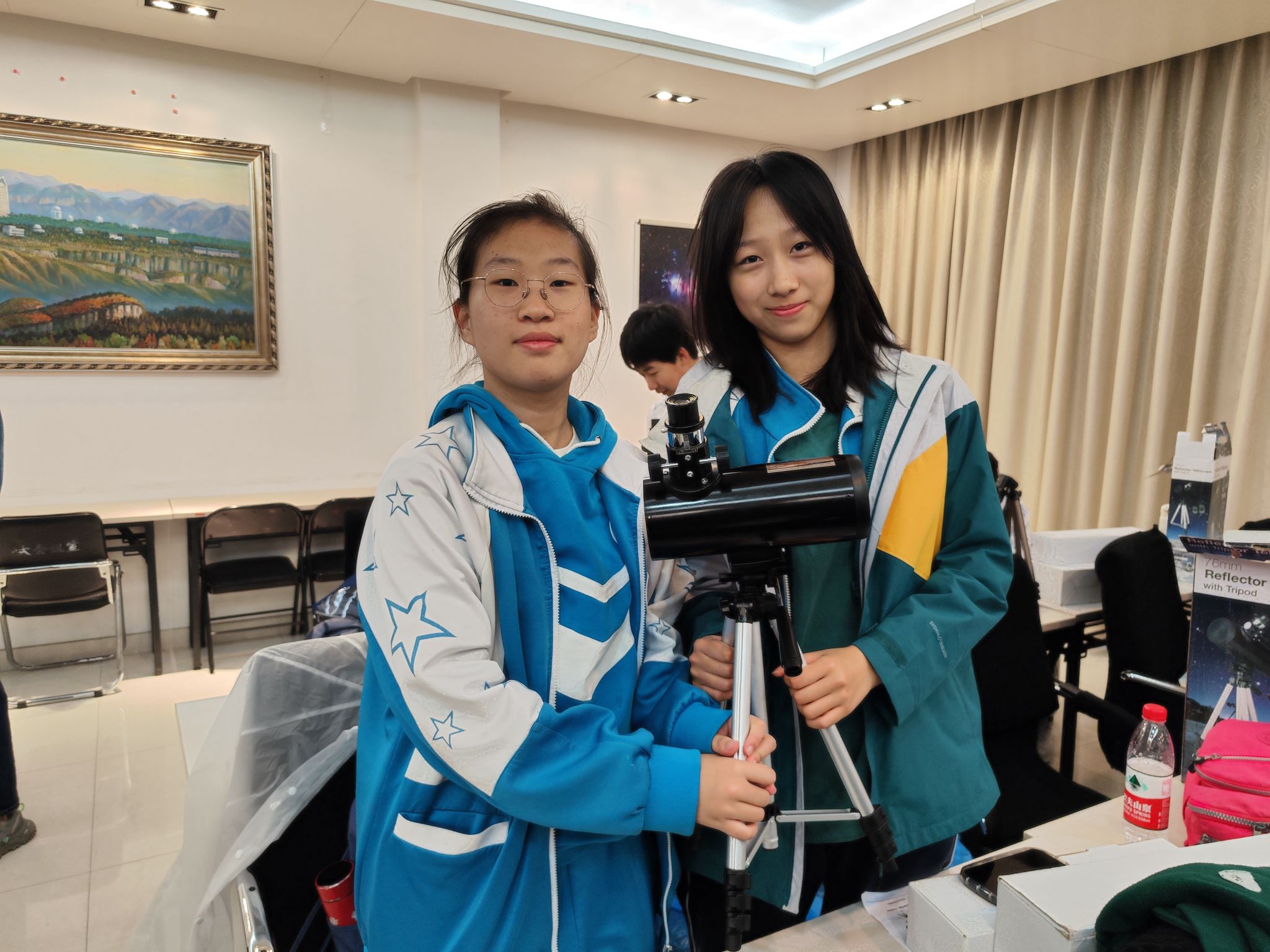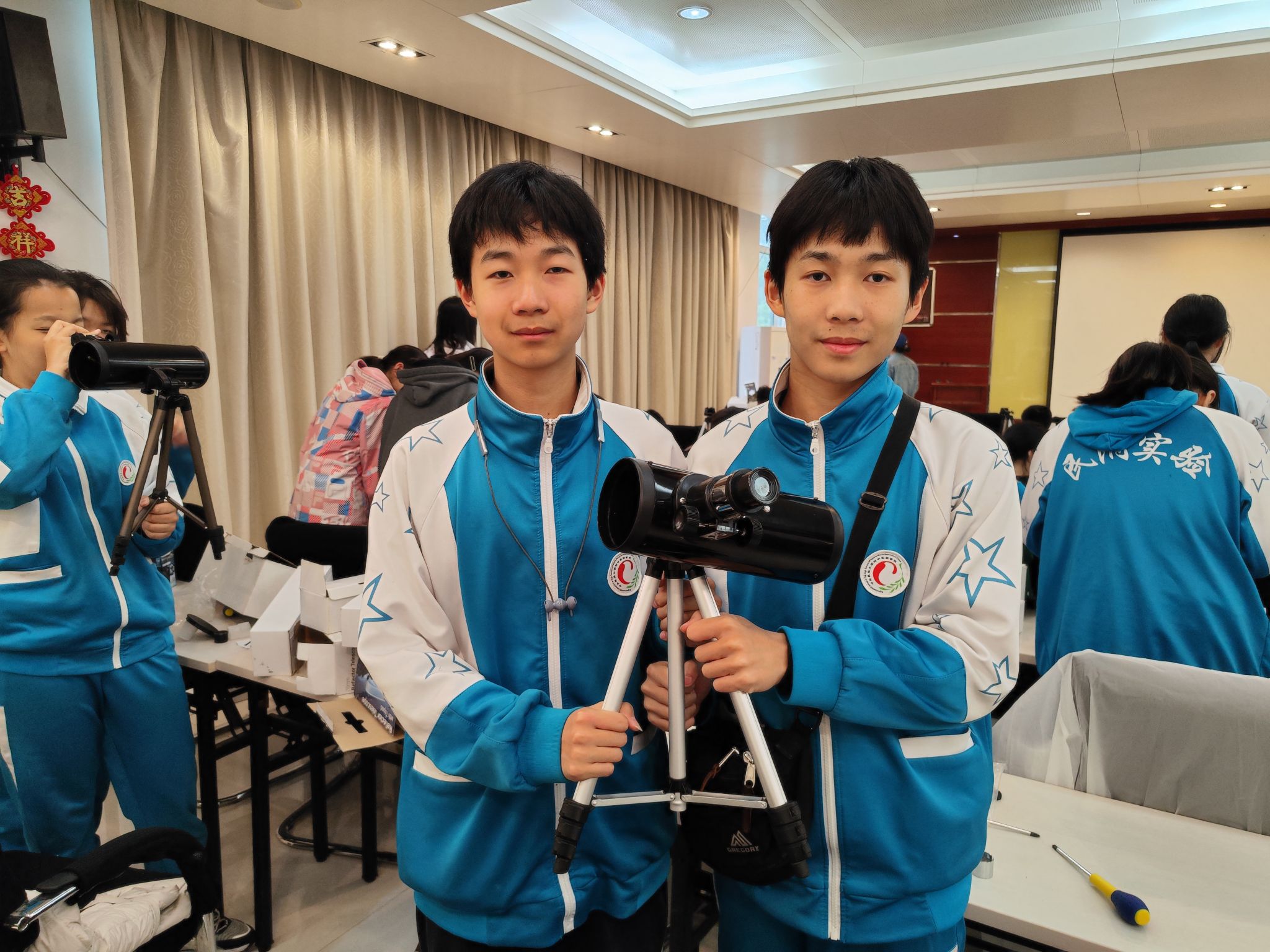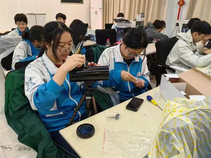 首先,同学们在老师的指导下开始组装望远镜。同学们通过观察与推理将各个部分一一组合,使这两张小小的平面镜,成为了看透宇宙奥秘的神奇工具。经过调光、汇交,墙上的星空图片被看得一清二楚,一个山坡上不起眼的松果也被放大得毫发毕现。整个多功能厅洋溢着欢笑,惊叹鼓掌声不绝于耳,同学们相互交流讨论,师生积极互动,场面其乐融融。这次难忘的动手实操经历不仅让同学们更深刻地认识理解了天文望远镜的工作原理、丰富了知识,更激发了同学们在实践中不断提升自我的兴趣与热情,令同学们受益良多。