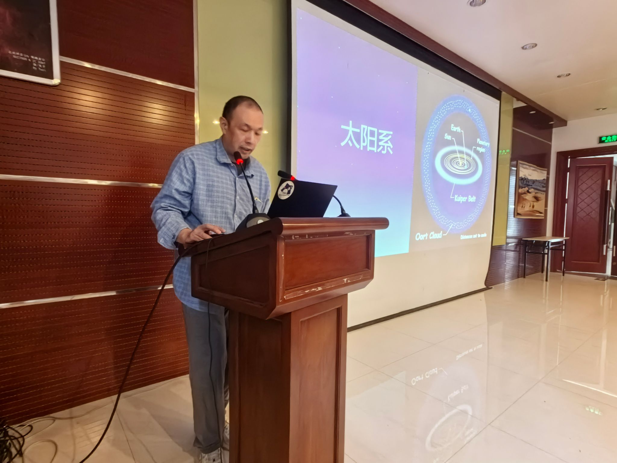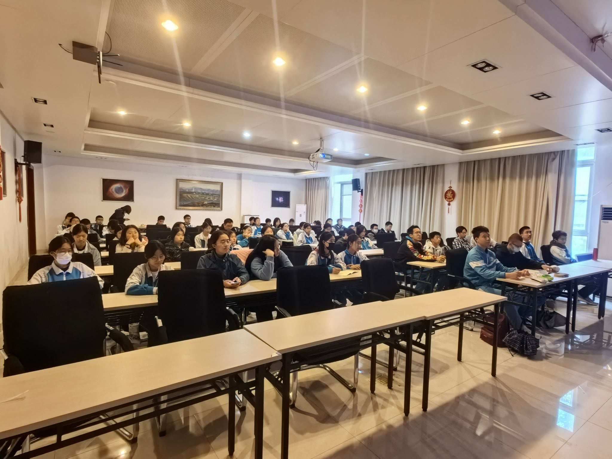 接下来,兴隆天文台观测基地的朱老师给带来了“宇宙之美—从地球到可观测宇宙”的主题报告。由人类生活的太阳系,到浩瀚无垠的银河系,再到无穷无尽的星系世界,进而引出无垠宇宙的起源奥秘。专家以严谨有趣的口吻向大家讲述了宇宙的结构、开端、演化及其研究过程。“如果把太阳比作一个篮球,那么地球只是一粒大米,而太阳与地球之间的距离,则是将篮球与大米分别置于篮球场两侧球框下时其间的距离。”在生动通俗的讲述中,同学们尽情领悟宇宙之美,感受星河之远。