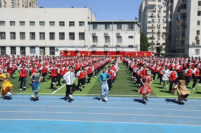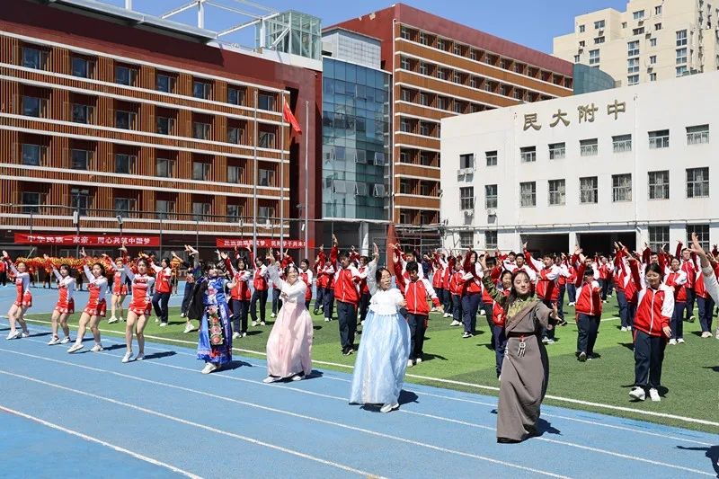首先是全体同学展示民大附中特色课间操《爱我中华》民族韵律操,该套操采用汉族、藏族、蒙古族、维吾尔族、傣族、朝鲜族、佤族、彝族等各民族舞蹈与健身操融合,伴着《爱我中华》的歌曲旋律,展现了青春之美,更展现出了“中华民族一家亲,同心共筑中国梦”的美好愿景。