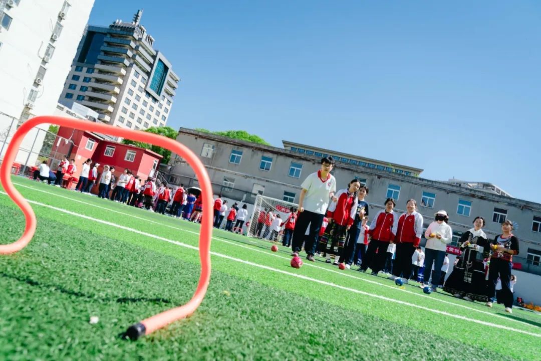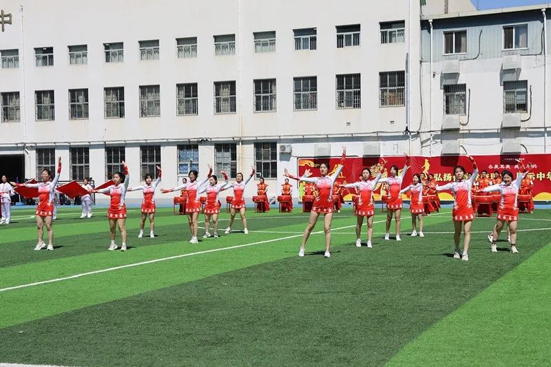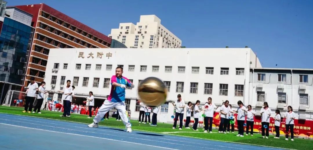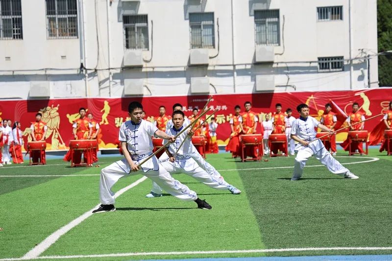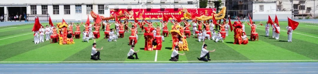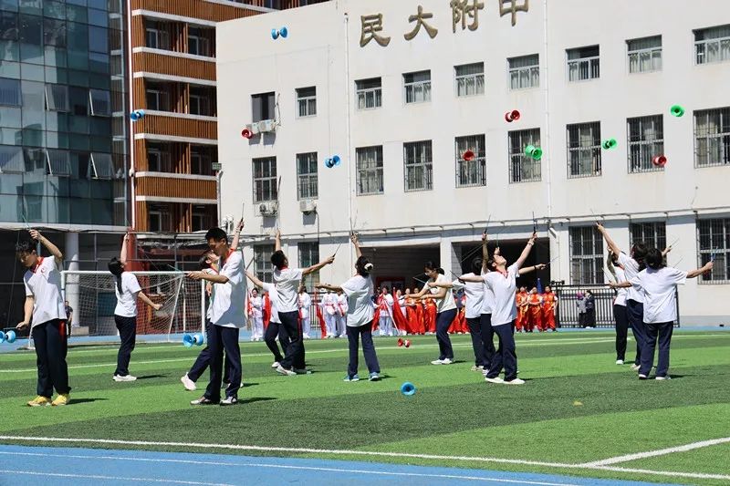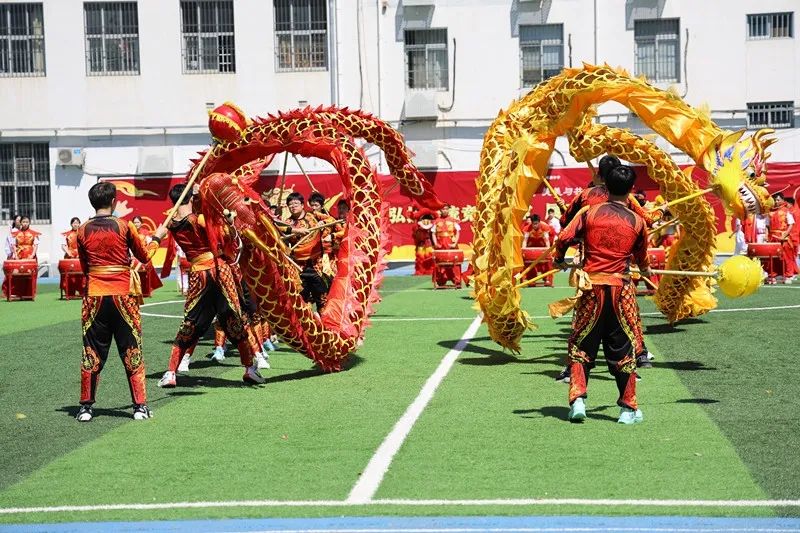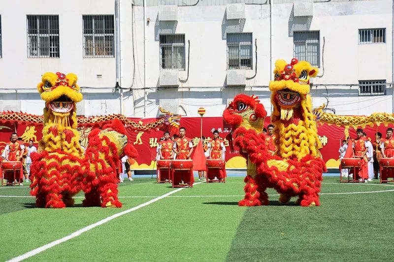 红旗飘扬,龙狮起舞,锣鼓齐鸣!在中华大地的流传千年的舞龙舞狮、中华武术在民大附中的操场上巧妙融合,释放更强大的生命力,激励着民附人团结一心、奋发向前。