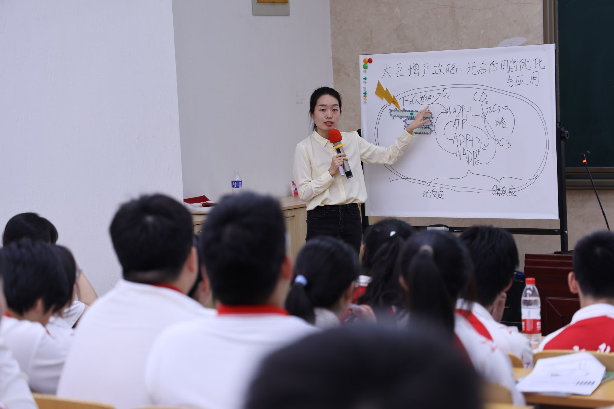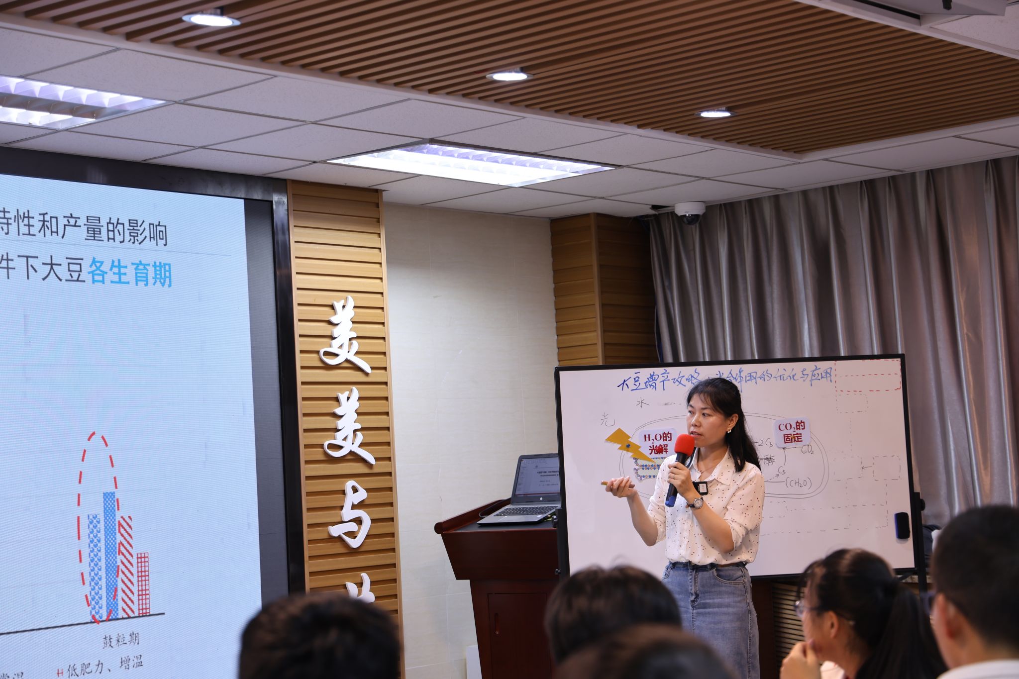 张轶伟老师展示了本单元第3课时《改造光合作用过程》。他引导学生对不同光合途径、不同实验方案及不同处理的实验数据进行比较,探索光合作用优化思路。通过模拟将CAM途径引入C3植物大豆、提高大豆光合作用/光保护的切换效率两个课题的研究历程,引导学生学习从问题提出到方案设计,再到技术实施最后检测优化的基本流程,体会技术进步与应用、多学科交叉渗透等对于科学发展的重要作用。通过对大豆光合作用分子水平上的优化,使学生感受到科研工作者在农业增产领域的不懈追求,提升国家粮食安全的责任意识。