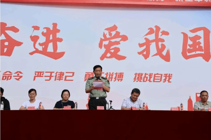 在开营式上,李品副书记指出,“青春向党铸忠诚,挺膺奋进担使命”是每一位青年学子铭刻于心、付诸行动的青春誓言,希望同学们以充沛的热情投入军训,刻苦训练、勇于拼搏,要在军训中增强爱国主义精神、锤炼坚韧不拔的意志品质、提升团结协作的能力,为未来的学习生活打下坚实的基础,为坚守爱国初心、砥砺报国志向、坚信强国有我注入前行的动力;希望教官和老师们通力合作,携手为培育具有强烈社会责任感、创新精神和实践能力的新时代青年贡献力量。承训总教官潘昊坤强调了国防教育的重要意义与必要性,对全体军训教官提出了严格的训练要求,也向全体学生明确了军训期间的各类纪律规定。他代表全体教官,期望同学们勇于吃苦、严守纪律、虚心求教。潘昊坤教官期待同学们能够成长为意志顽强、纪律严明、热爱党和国家的当代优秀中学生,成为社会主义建设的中坚力量与可靠接班人。