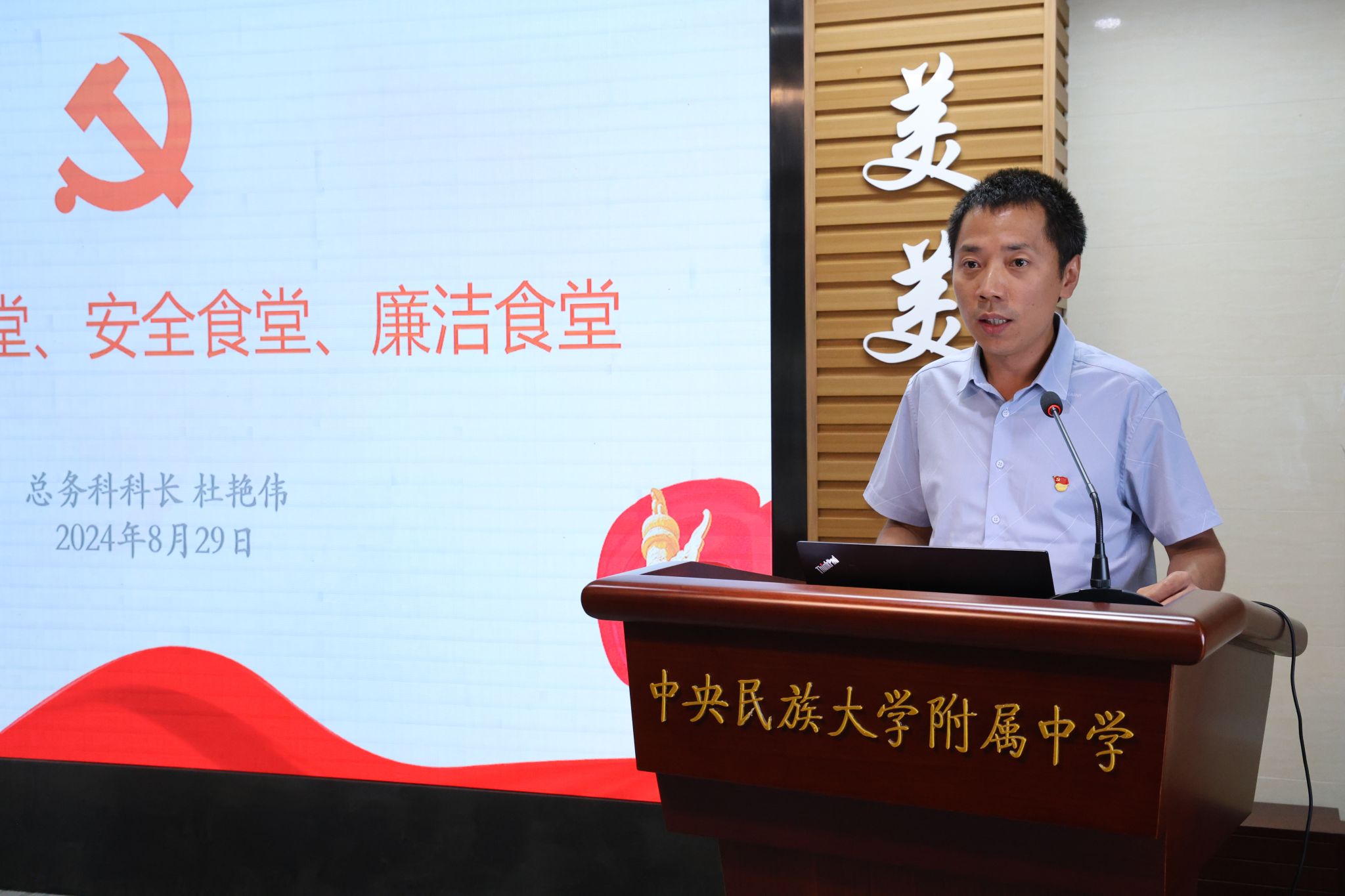 总务科科长杜艳伟以《创建规范食堂、安全食堂、廉洁食堂》为题,重点针对食堂管理作了迎检和整改工作总结,传达了全市基础教育重点工作全员实训工作部署,介绍了新学期工作思路。