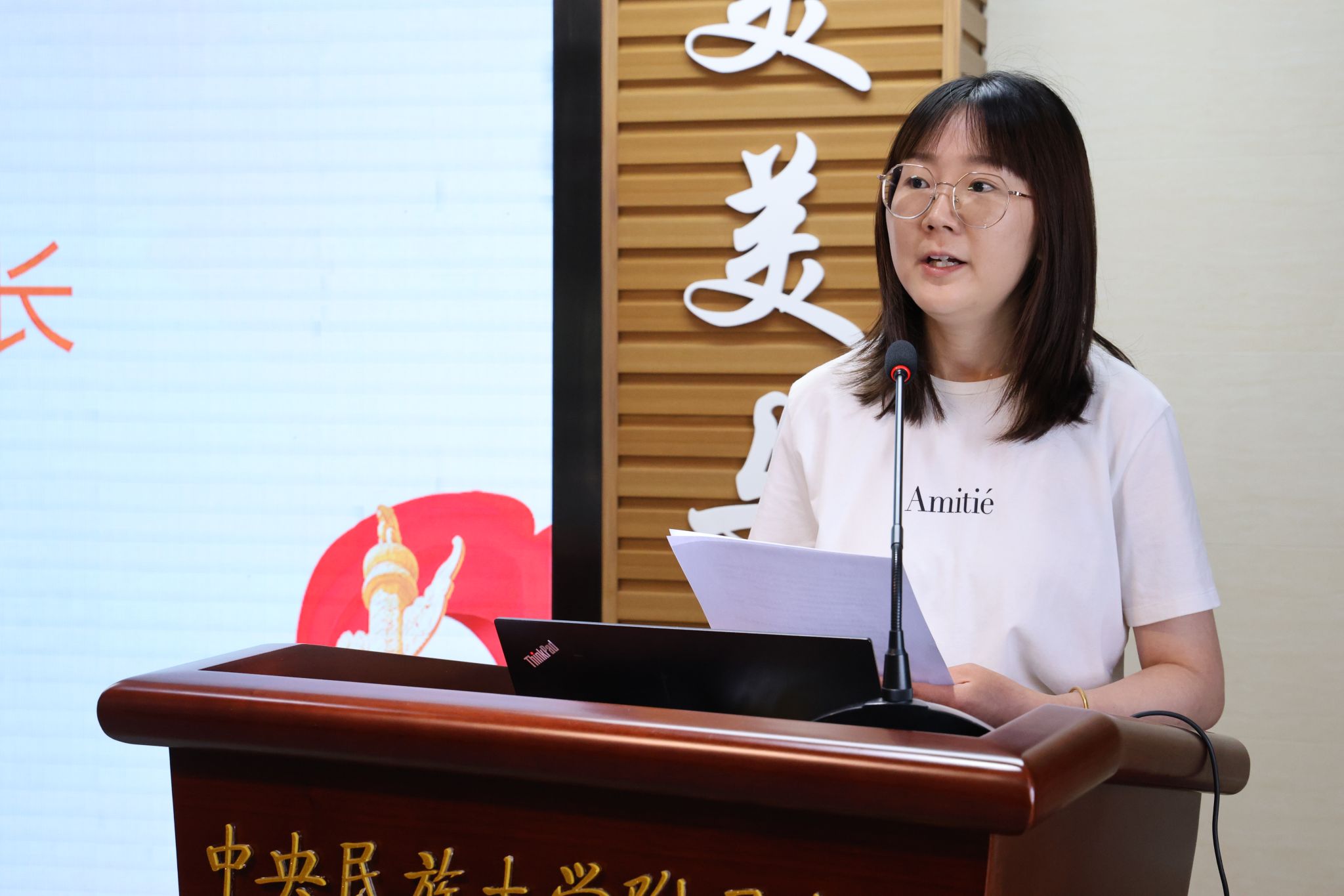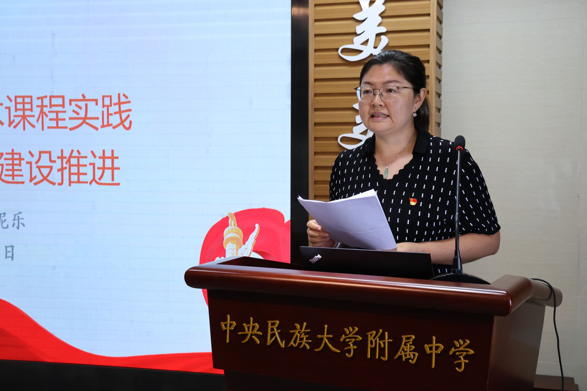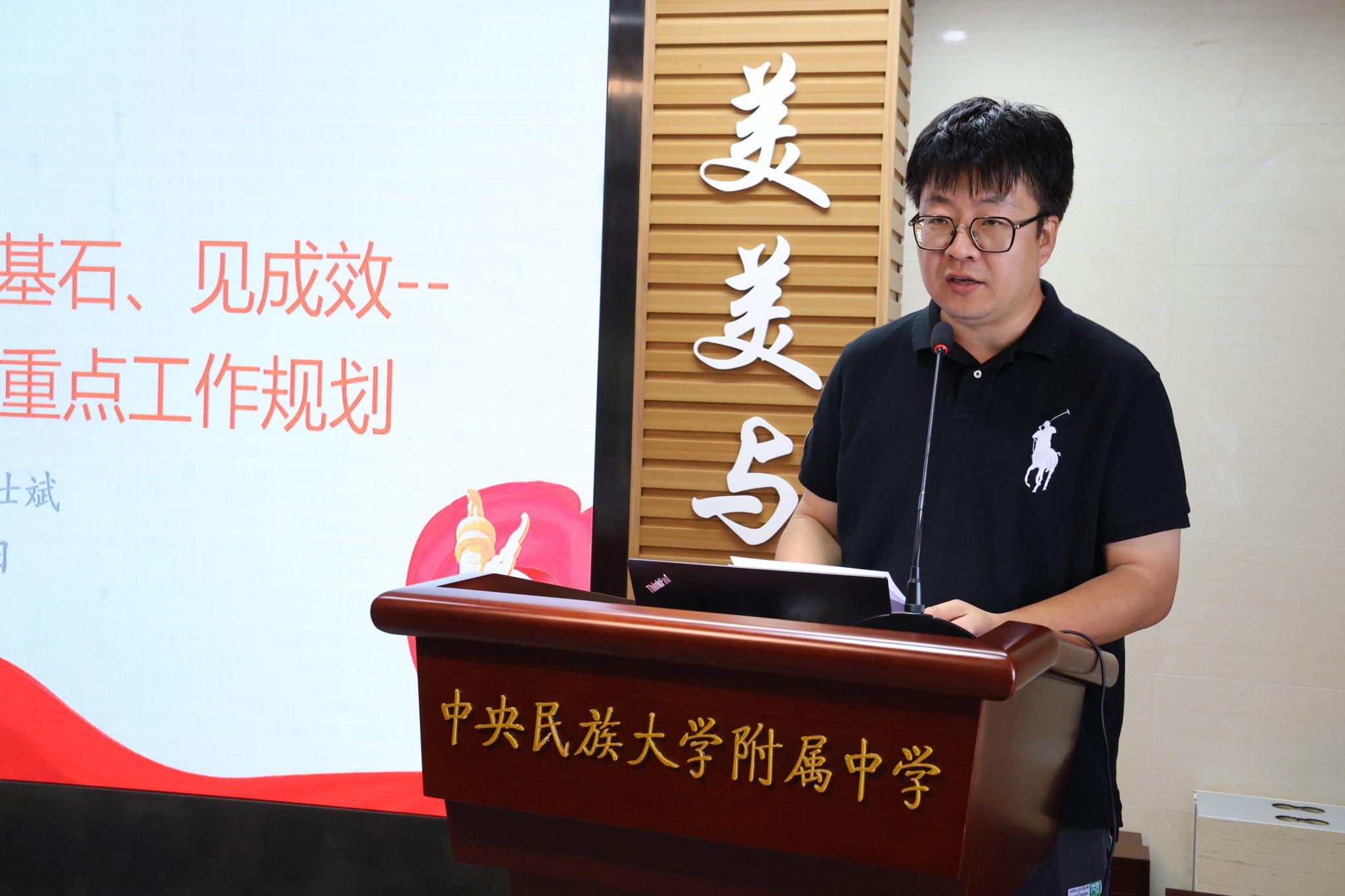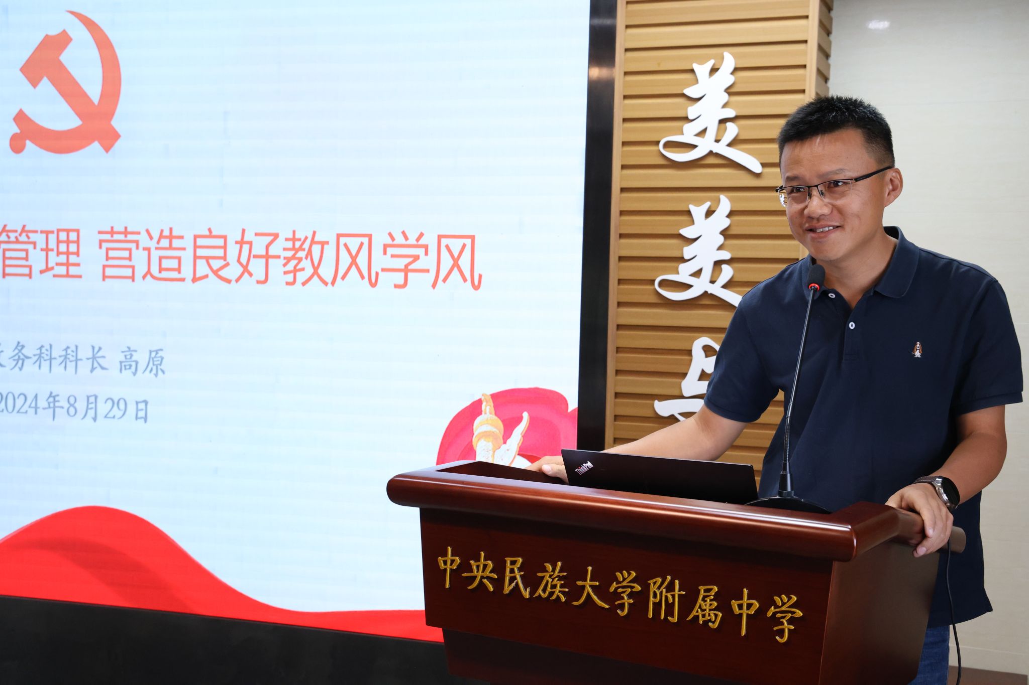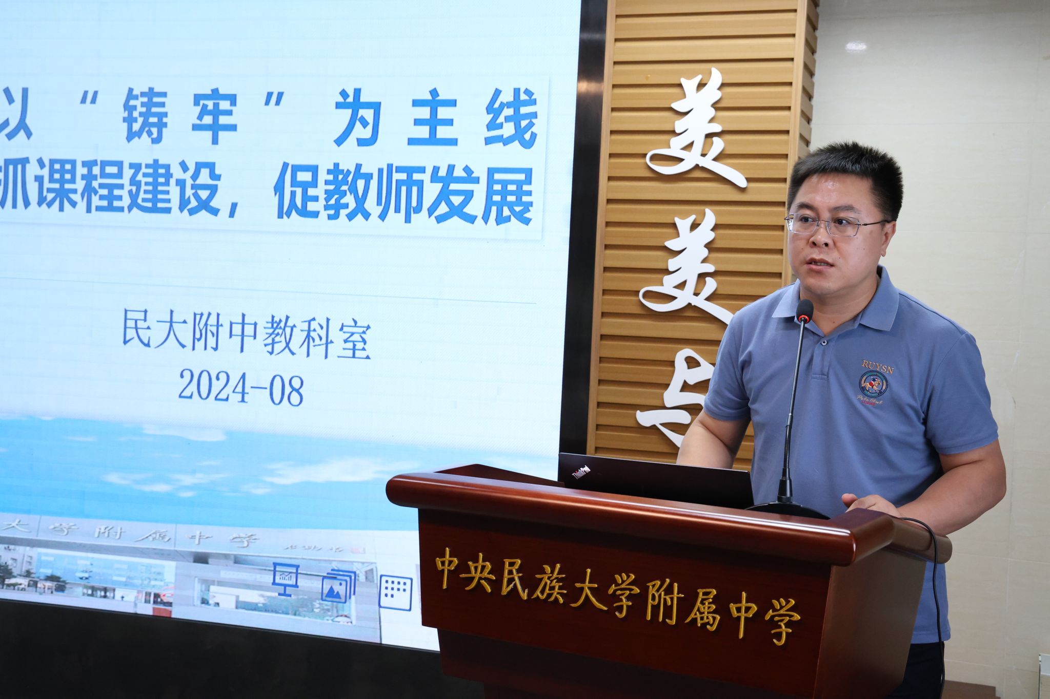 教科室主任姜明亮作《以“铸牢”为主线,抓课程建设,促教师发展》分享,介绍了本学期教科研着力方向是铸牢中华民族共同体意识教育的升格与成果提炼,阐释了新学期深化铸牢中华民族共同体意识教育具体举措及进一步加强课程建设的具体安排。