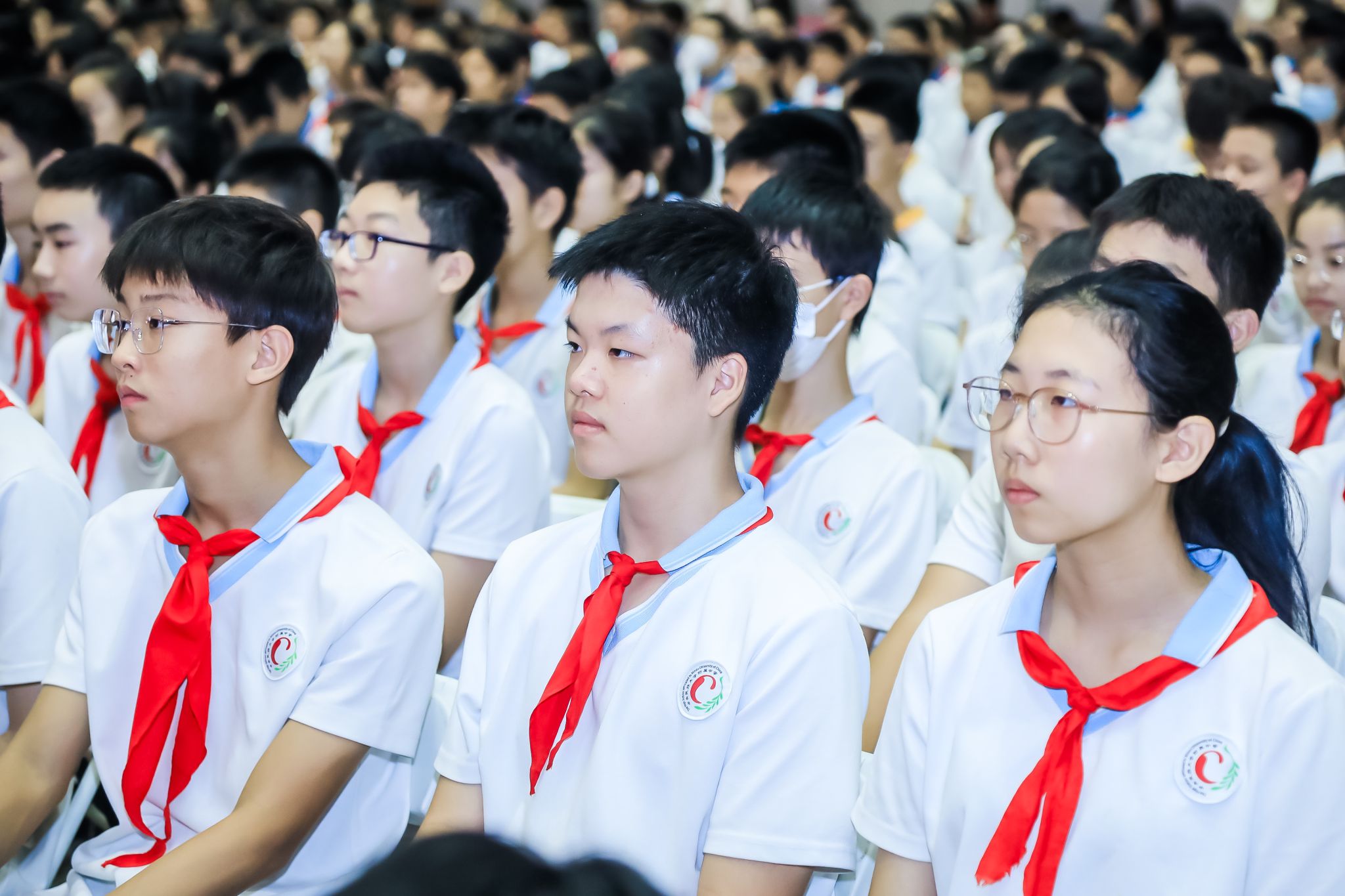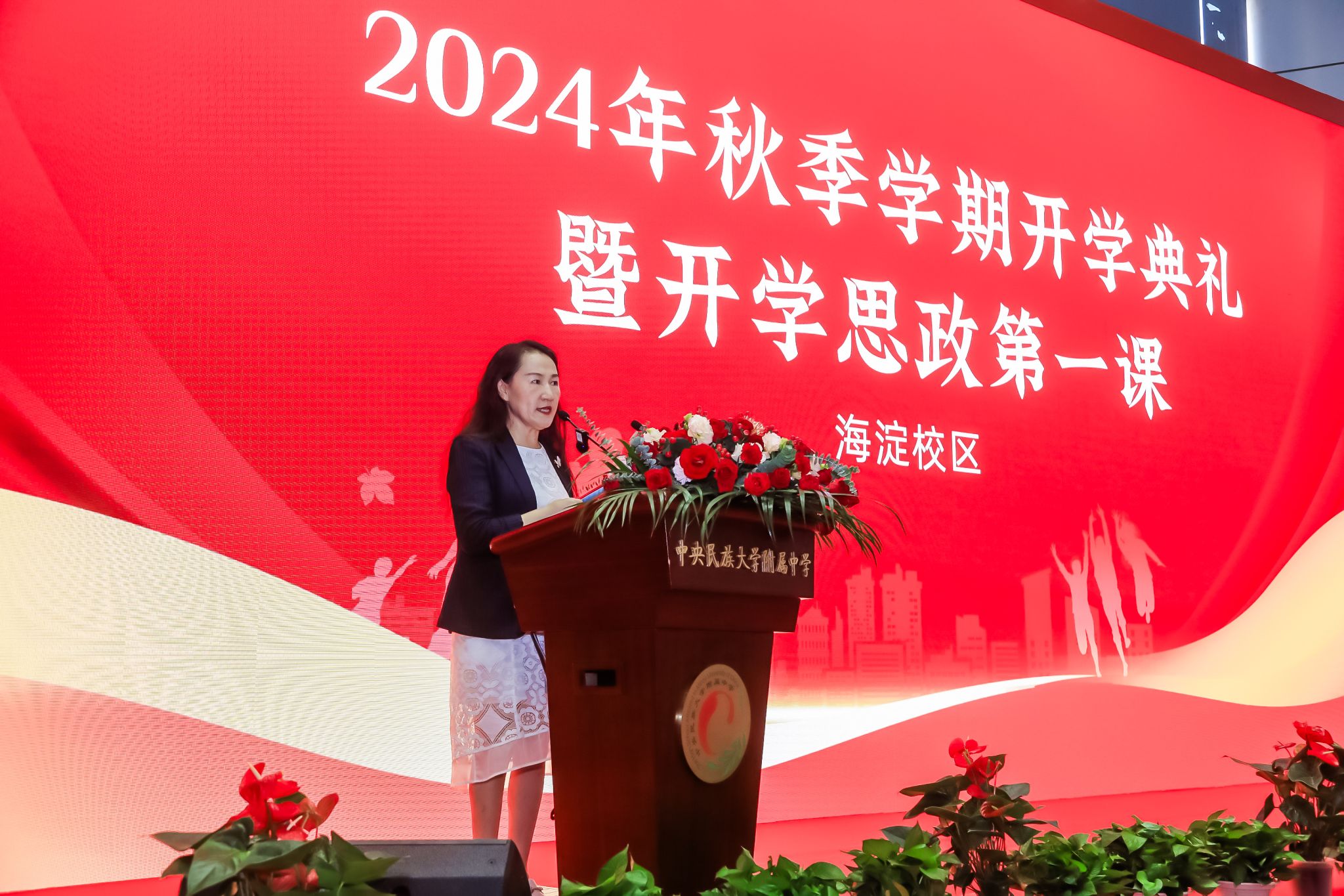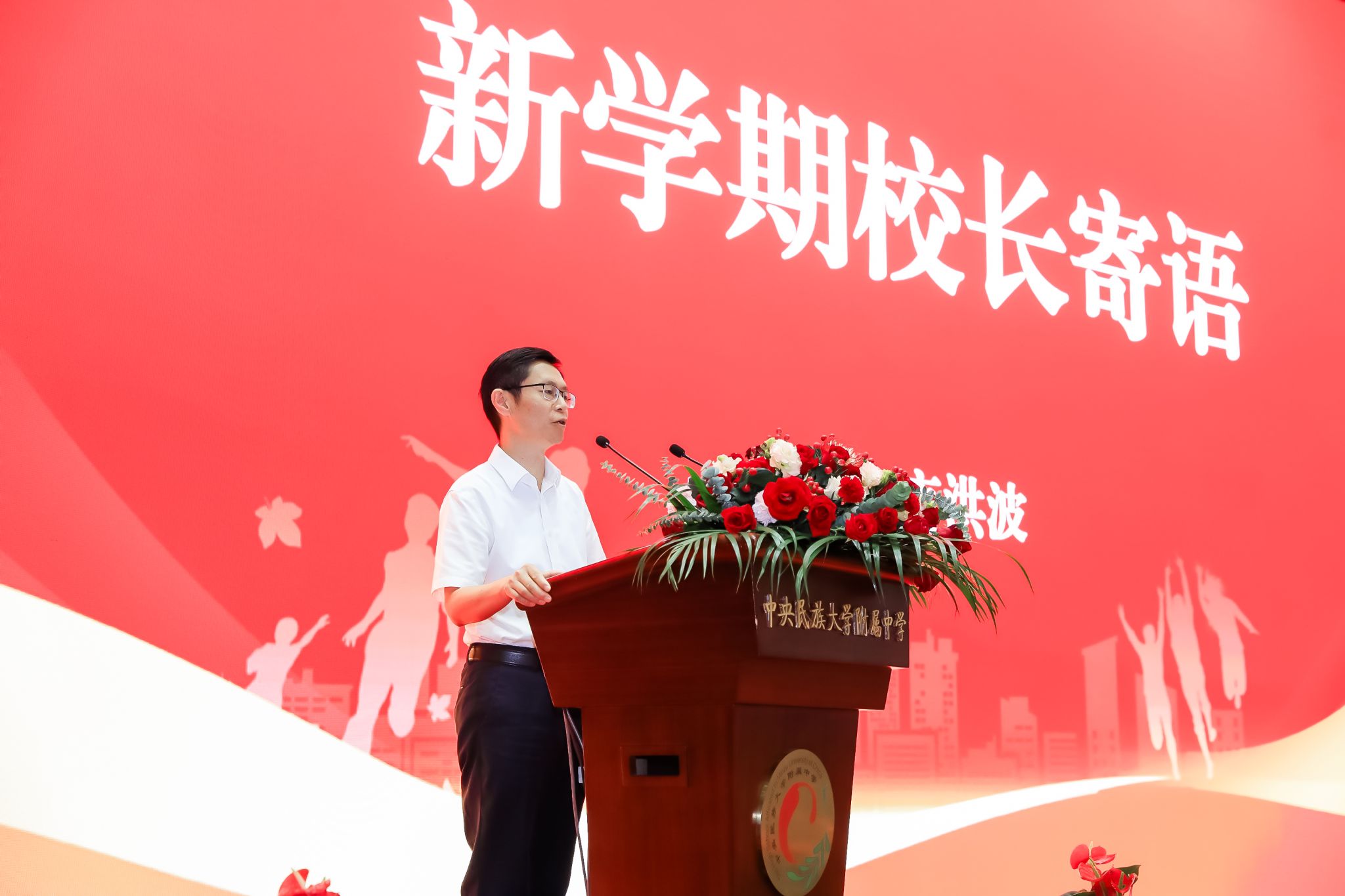 活动最后,唐洪波校长新学期寄语讲话。他回顾了学校悠久的历史与辉煌的成就,强调了民大附中肩负立德树人、培养优秀人才、服务国家发展的重大使命。唐校长表示,一代代民附人凭借着不懈的努力,在时光的长河中不断沉淀,将民附的精神传承并发展。正是他们的付出,铸就了各美其美、美美与共的校训精神。这一精神如同一股清泉,流淌在校园的每一个角落,滋养着每一位师生的心灵。唐校长鼓励同学们要以航天英雄为榜样,他们勇敢无畏地探索宇宙,为国家的航天事业做出了卓越贡献。同学们应树立远大理想,不畏惧困难与挑战,勇于担当作为,在成长的道路上绽放出属于自己的光彩。唐校长深情地说,让我们共同努力,共同前行。在实现中华民族伟大复兴的壮阔征程中,把青春的热情与活力融入国家的发展之中。青春,如同一朵盛开的花朵,充满着生机与希望。将青春融入国家发展,便是让这花朵在祖国的大地上绽放出最绚烂的色彩。我们要奋楫扬帆,在知识的海洋中勇敢前行,不惧风浪;行稳致远,以坚定的步伐迈向未来,不被困难所阻挡。相信志之所趋,必将无远弗届。