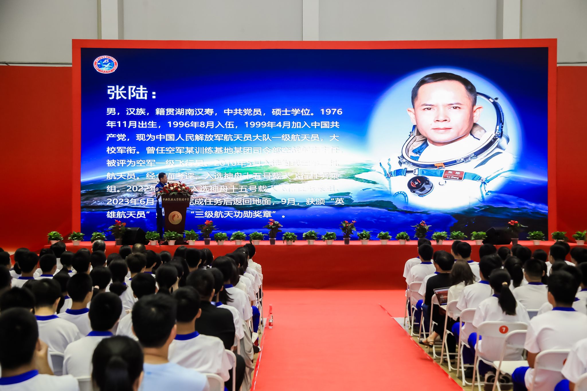 张陆航天员为全校师生带来了一场主题为“星空浩瀚无比,探索永无止境!”的航天精神分享。他详细介绍了神舟十五号从发射到返航的全过程,在轨半年,首次实现“太空会师”,4次出舱刷新航天员单个乘组出舱纪录,多个“首次”科学实验等经历让同学们对航天科技有了更直观的认识。