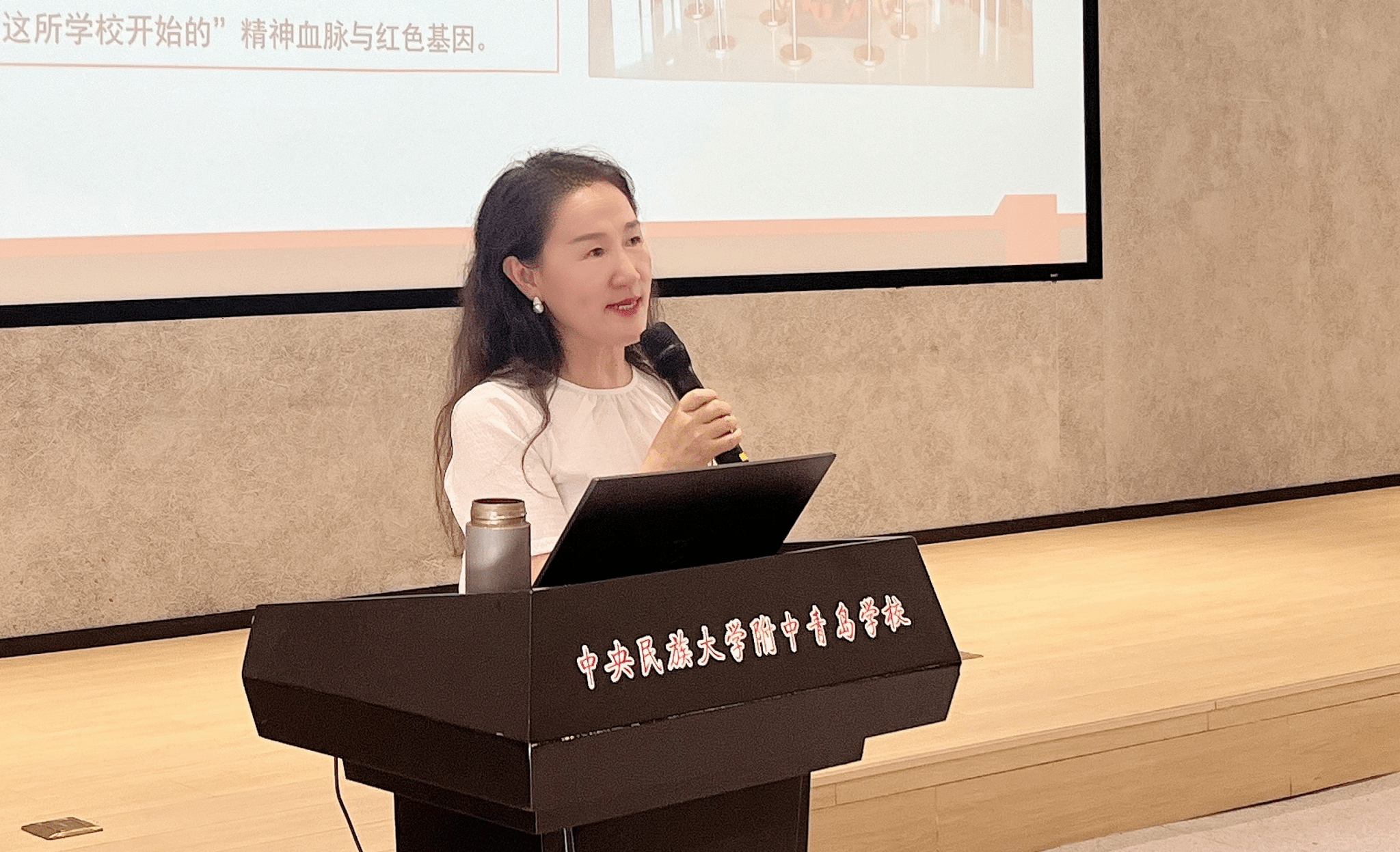 佟书记以《传承红色基因 培育时代新人》为题,围绕百年民附校史中的红色故事、新时代中央民大附中的红色基因传承、集团总校引领青岛分校高质量发展三个方面娓娓道来,为青岛分校师生讲授了一堂生动的思政课。