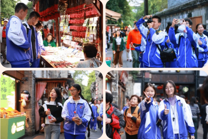 成都是中华文明的重要发祥地之一,也是我国西南地区社会经济发展的领头羊之一。蜀锦兴于春秋战国而盛于汉唐。夜幕降临,灯火摇曳的锦里古街,充满了浓郁的巴蜀风情。同学们徜徉其间,体会着巴蜀文化的深厚底蕴和绚丽色彩。锦里古街的喧嚣热闹,不只是市井的风情,更是巴蜀文化源远流长的民间记忆。