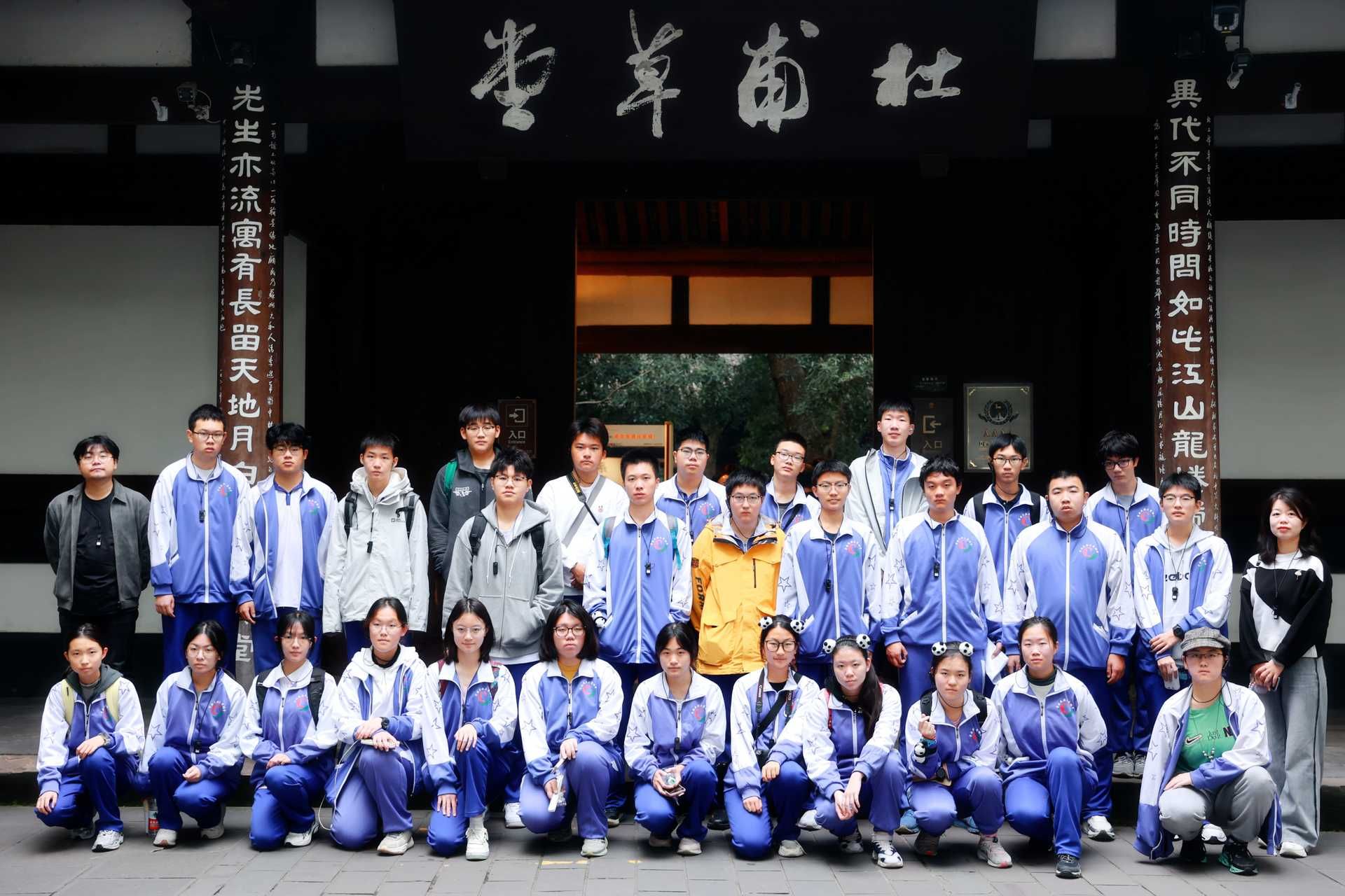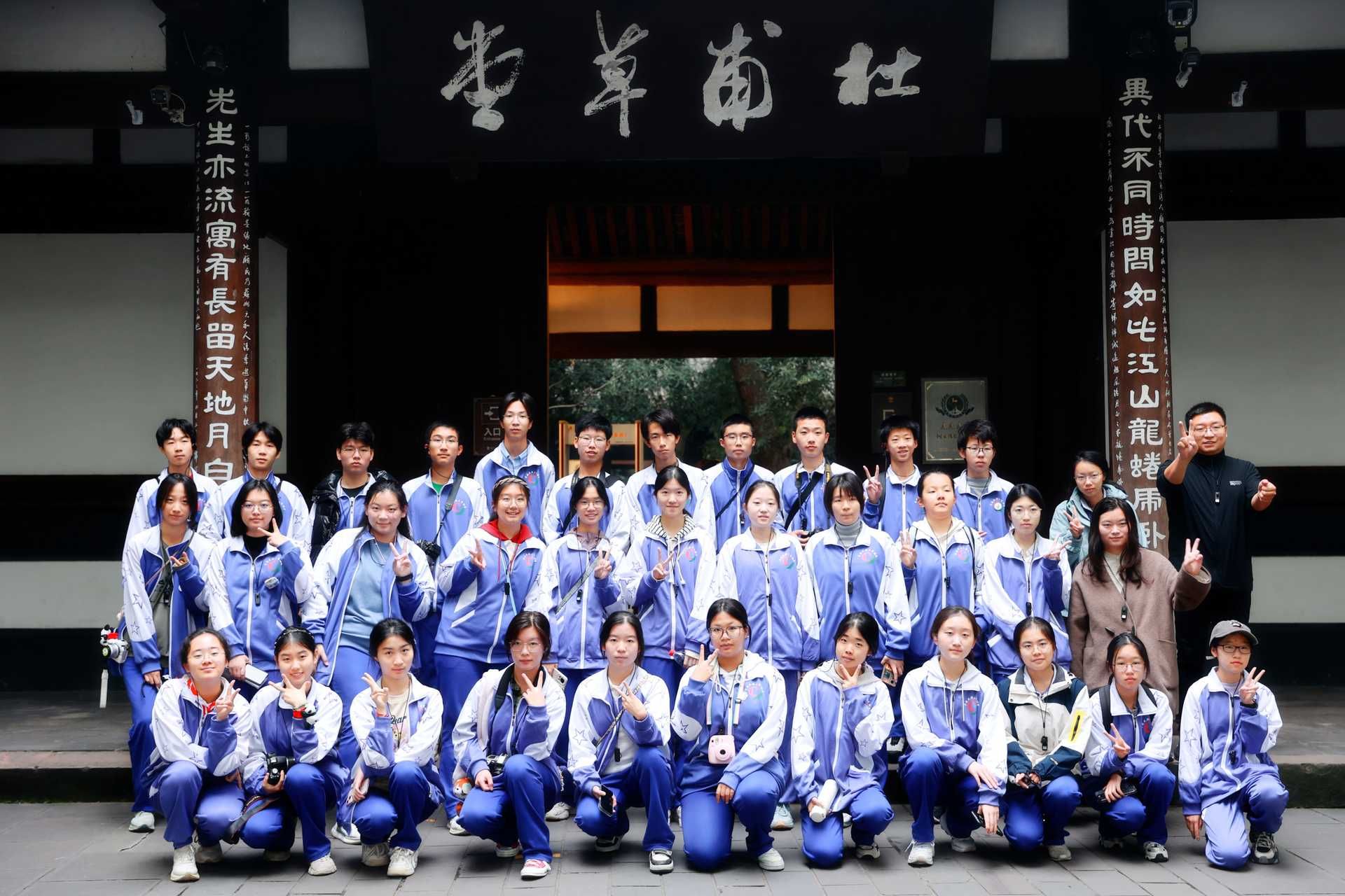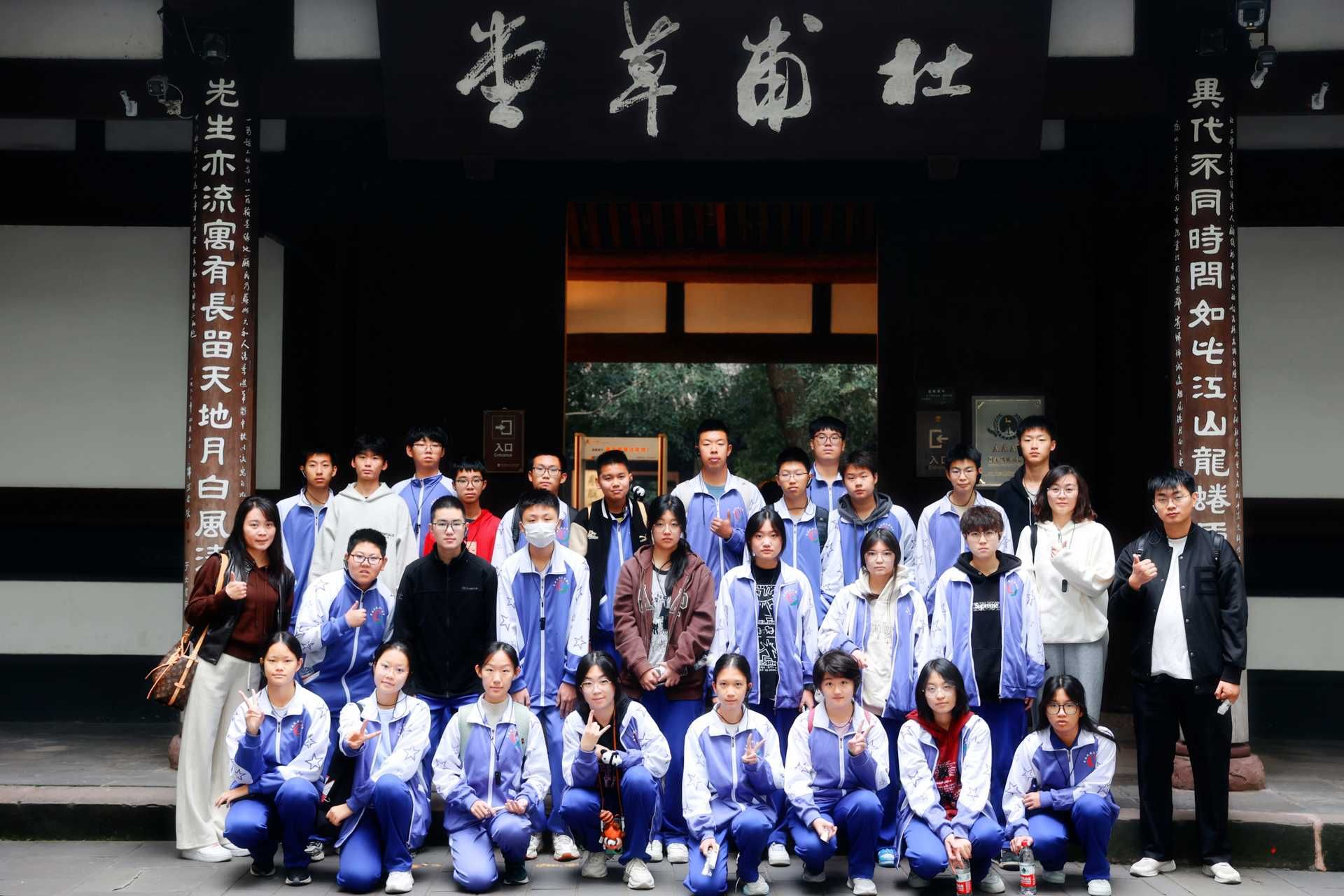 明媚的清晨,学生们满怀着敬意来到了杜甫草堂。一踏入草堂,便被浓浓的诗意氛围所感染。幽静的竹影,清澈的溪流,古朴的建筑,将我们带回了那个诗人才华横溢的时代。简陋的陈设,斑驳的墙壁,无不诉说着诗人当年清贫的生活。正是在这样的环境下,杜甫创作了诸如《茅屋为秋风所破歌》《登高》等脍炙人口的诗篇。在老师的指导下,学生们分析了杜甫诗歌的意境与情感,从中领悟诗人忧国忧民的情怀。大家争相在研学手册中记录下自己对诗句的感悟,更加理解了诗人心怀天下的家国情怀。