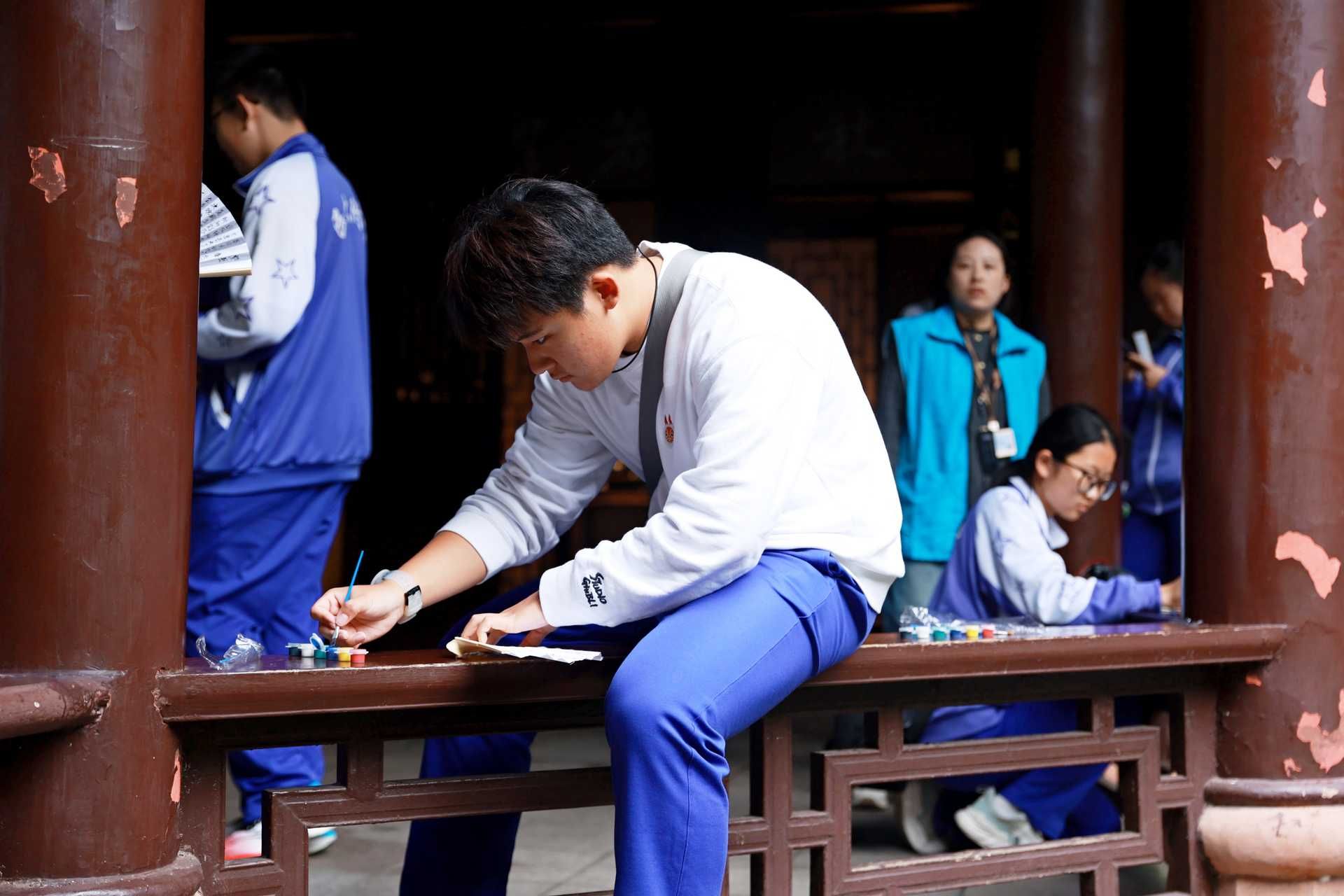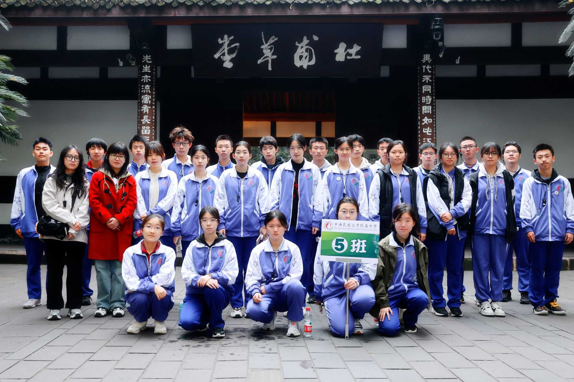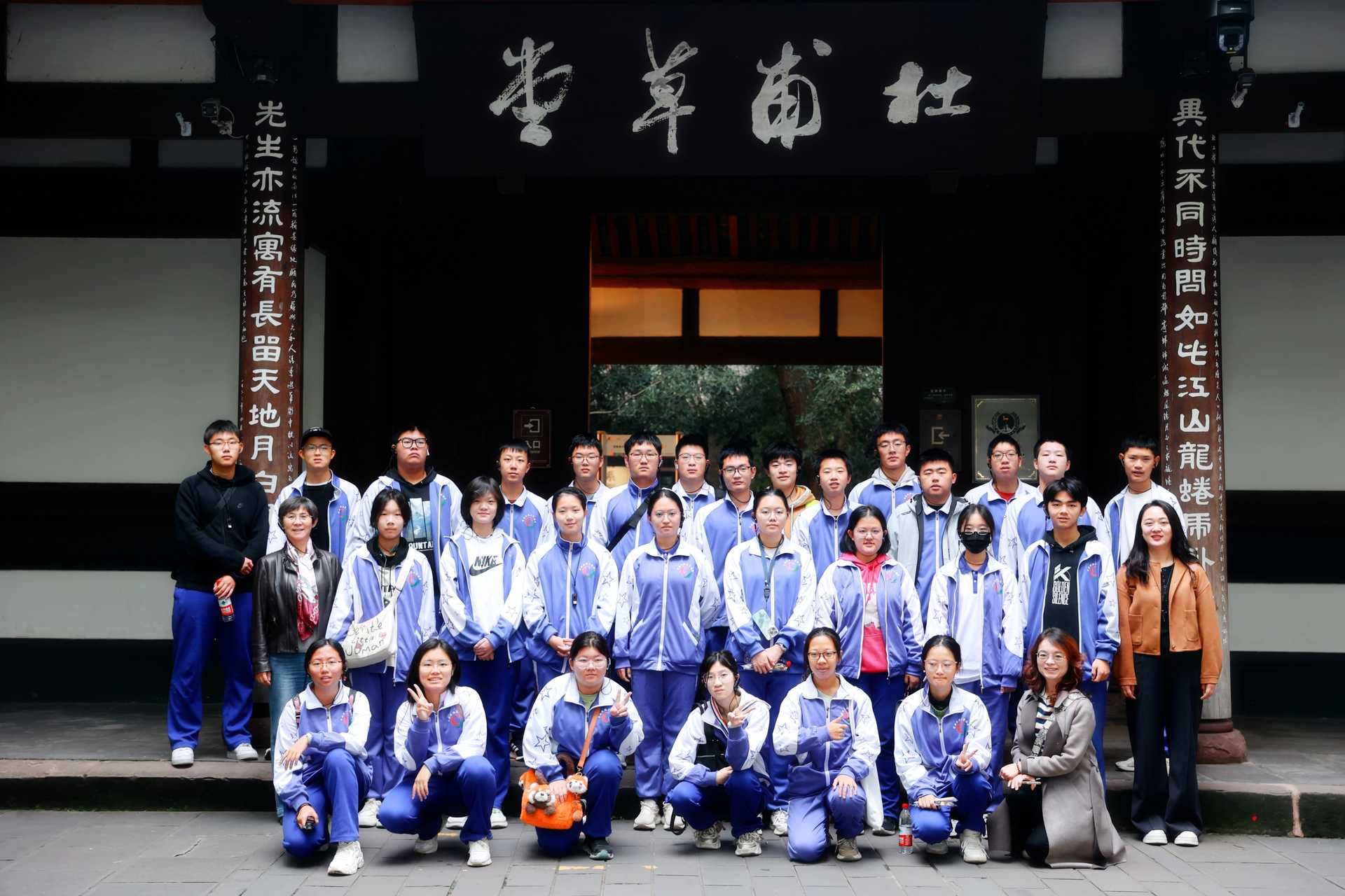 明媚的清晨,学生们满怀着敬意来到了杜甫草堂。一踏入草堂,便被浓浓的诗意氛围所感染。幽静的竹影,清澈的溪流,古朴的建筑,将我们带回了那个诗人才华横溢的时代。简陋的陈设,斑驳的墙壁,无不诉说着诗人当年清贫的生活。正是在这样的环境下,杜甫创作了诸如《茅屋为秋风所破歌》《登高》等脍炙人口的诗篇。在老师的指导下,学生们分析了杜甫诗歌的意境与情感,从中领悟诗人忧国忧民的情怀。大家争相在研学手册中记录下自己对诗句的感悟,更加理解了诗人心怀天下的家国情怀。