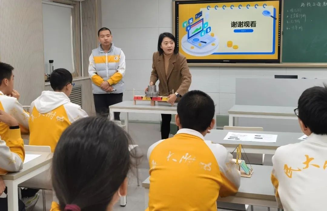 课堂展示之后,初三年级物理教师李超群进行了主题为《跨校区桥梁设计》的课题中期成果汇报。课题推进过程中充分利用人工智能技术以提高效率,帮助学生实现跨学科素养的提升。汇报完毕后,专家充分肯定了项目的设计理念和扎实进展,同时也在策略整合方面给出了可行性建议。