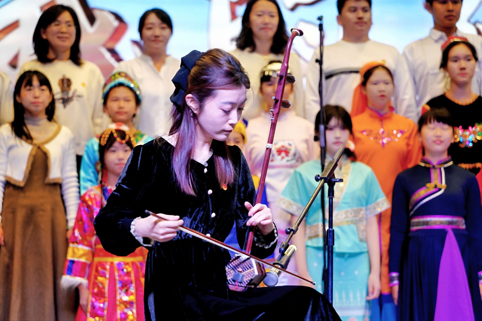 合唱展演在璀璨的灯光下热烈启幕,民附师生身着校服、正装与民族服饰,以饱满的热情和昂扬的姿态,齐声唱响《保卫黄河》,青春的歌声在民大礼堂中回荡,拉开了这场音乐盛宴的序幕。