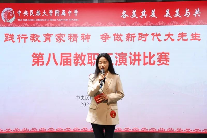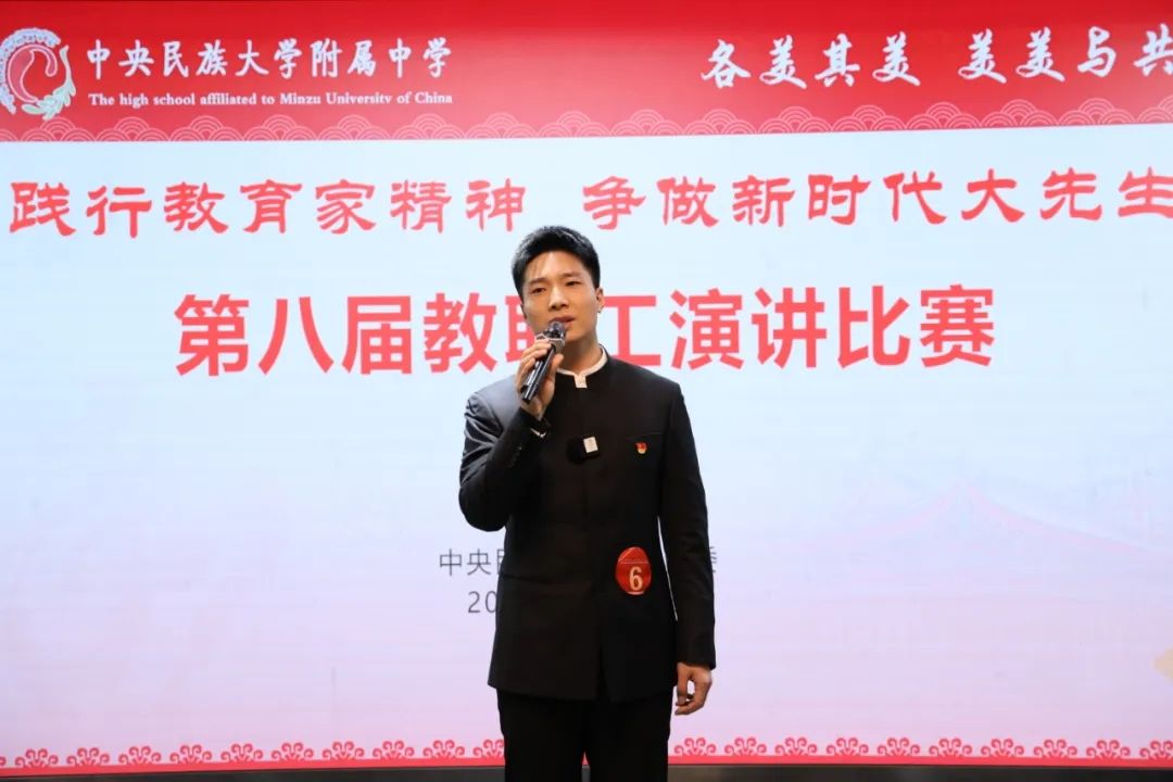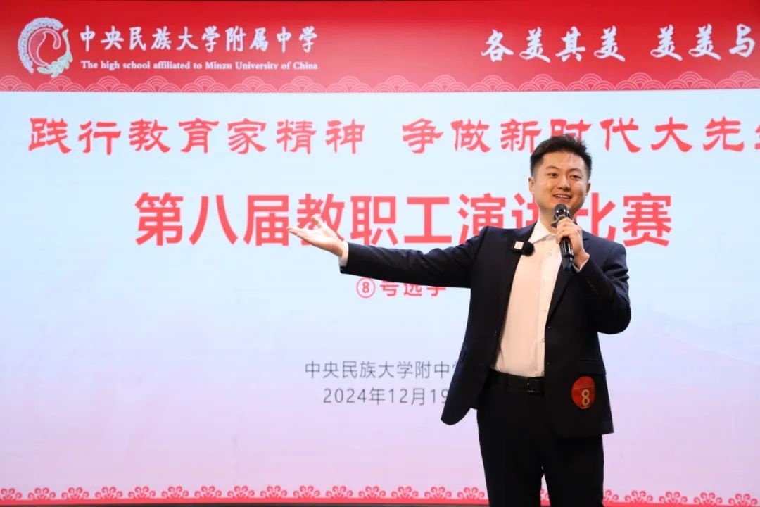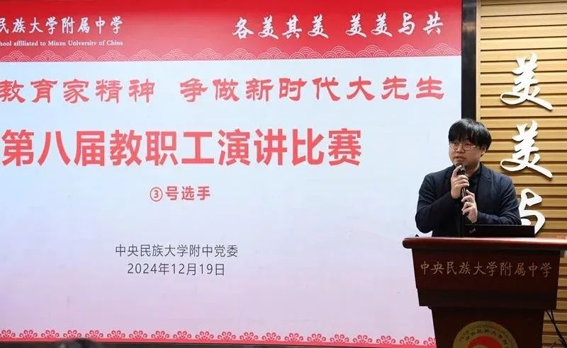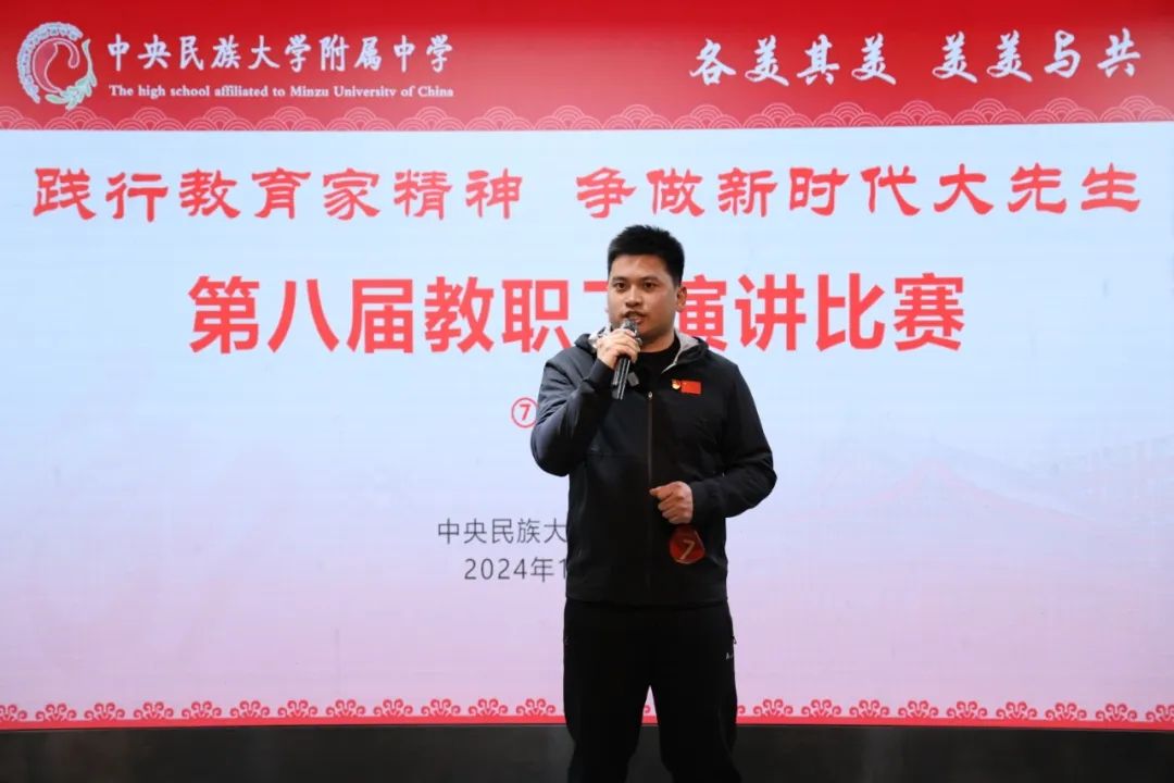 海淀校区2024级教师党支部张雨石海淀校区2024级教师党支部张雨石老师作了题为《弘扬教育家精神,点亮教育新征程》的演讲。他通过分享民附教师团队教书育人的点点滴滴,诠释践行教育家精神首先需要在为学上扎实基础,追求“大”方法;还需要在为事上修养仁爱之心,孕育“大”情怀;更需要在为人上坚定信念,培养“大”志向。