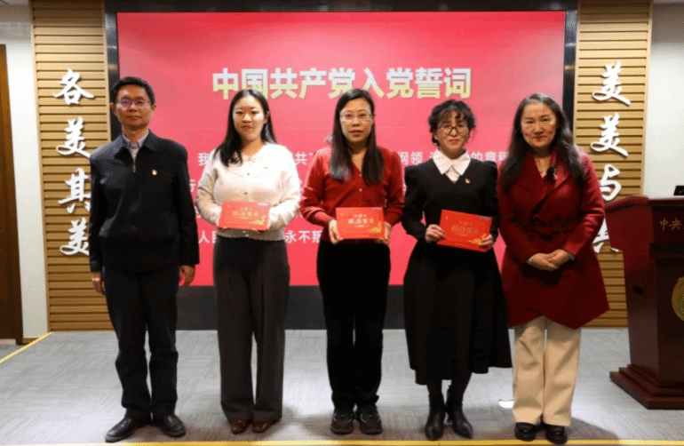 宣誓仪式结束后,党委副书记、校长唐洪波,党委常务副书记佟丽娟为新发展党员佩戴了党徽,并发放政治生日卡,激励新党员时刻牢记党员身份,笃行实干、初心如磐,竭尽所能为民附高质量发展贡献力量。