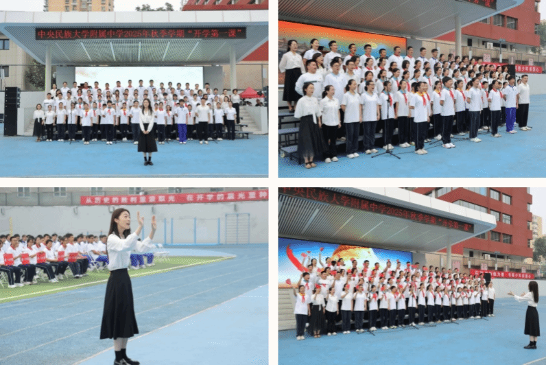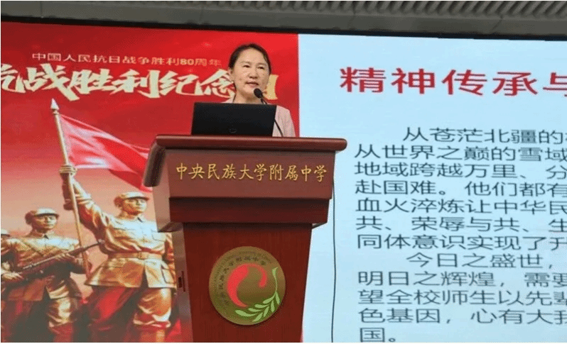佟书记表示,纪念中国人民抗日战争暨世界反法西斯战争胜利80周年大会已圆满落幕,这是一次生动形象、影响深远的新时代爱国主义教育,极大增强了中华儿女的民族自豪感和民族自信心。在这样正当其时的时间节点上,民大附中也迎来了主题鲜明、别具特色的 2025 秋季学期开学第一课,我校师生代表用动情的歌唱、故事的讲述、经典的共读、科创的展示等多种形式呈现,诠释独属于民附人的血脉赓续与责任担当。
