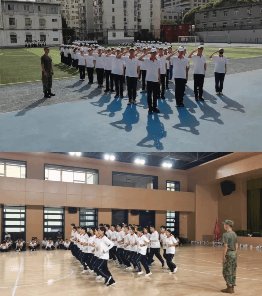 军训不仅有严苛的训练,更有丰富的特色活动,让新生们在传承中成长,在展示中绽放。学校组织新生学唱校歌,歌词中蕴含着民附这所百年老校的深厚底蕴,也唱出了民附学子的意气风发。2班刘欣然在学唱校歌时,深刻感受到学校的历史厚重与精神传承。旗语和军体拳方阵训练则让新生们体验到军人的飒爽,每一个动作都充满力量,彰显着少年的朝气。