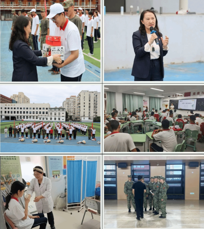 军训期间,学校始终将学生的成长与安全放在首位,组建了一支涵盖领导、教官、班主任、保障团队的“护航队伍”,为新生们筑牢成长的 “安全屏障”。 学校领导多次深入军训现场,亲切慰问坚守岗位的教官、班主任和保障人员,同时关心参训学生的训练进度与生活状况,用关怀为大家注入前行的力量。保障团队则细致入微,提前准备预防疾病的小贴士、制定呕吐物消毒方法,从健康防护到生活需求,全方位为军训保驾护航,让学生们在严苛的训练中也能感受到家一般的温暖。