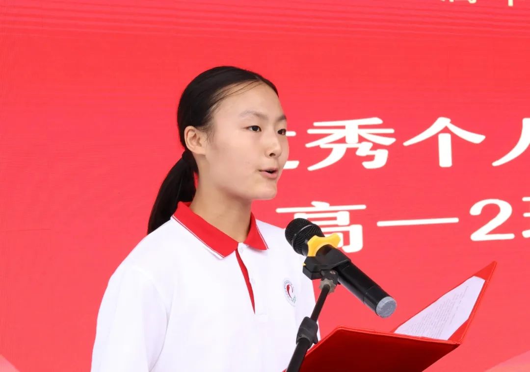 高一2班曹铭婵同学作为优秀个人代表发言,她说:“'奋斗是青春最亮丽的底色。'军训是我们中学生涯的'第一粒扣子',我们将把在军训中养成的好习惯、好作风带到今后的学习和生活中去,把坚忍不拔的毅力用于攻克学习的难题,把团结协作的精神融入我们的班集体建设。”