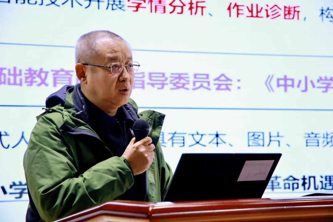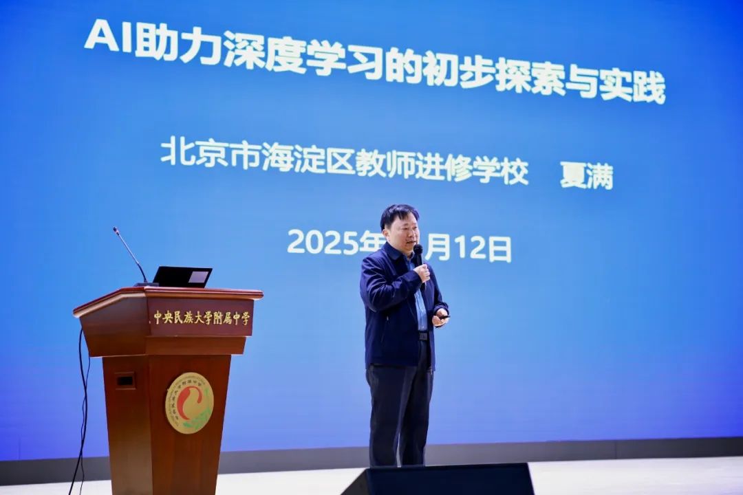 主旨发言环节,海淀区教师进修学校语文教研员夏满以《AI助力深度学习的初步探索与实践》为题,系统阐述了AI技术在语文核心命题萃取方面的理论基础方面的理论基础和实践路径,并结合区域内不同学段的典型课例,客观剖析当前教学实践中存在的现实困境并提出应对策略。他指出,面对智能浪潮冲击,教师必须坚守育人本位,回归教育初心,真正做到理解学生、尊重成长。