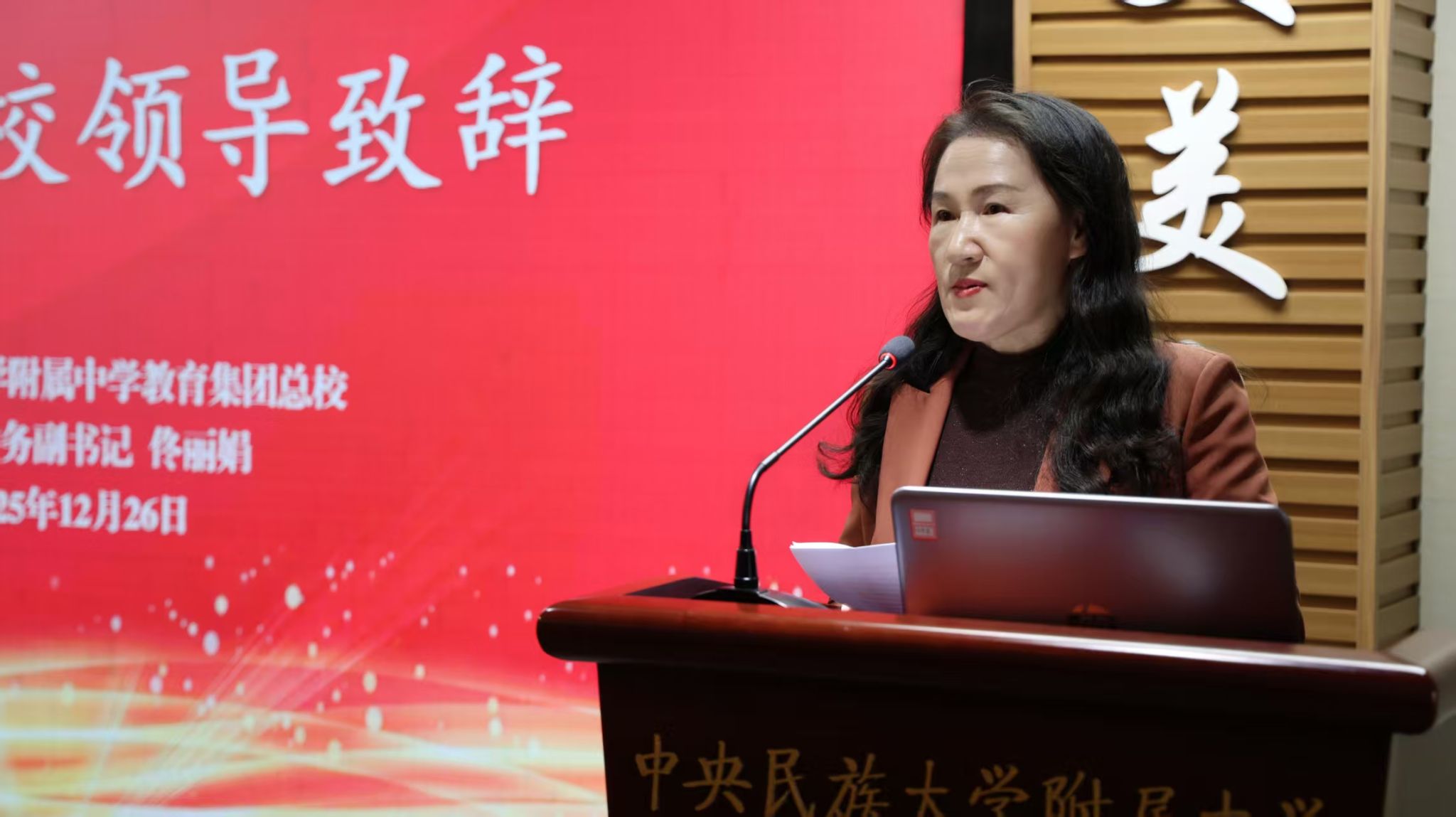 佟丽娟在致辞中,以坚定而自信的话语,回顾了我校教职工演讲比赛九年来的成长轨迹。她说道:“九年,足以让一个活动沉淀为一种传统,也足以让一场讲述升华为一种精神的力量。”她将这项比赛比作民附教师的一次年度归航,是集团党建与教育融合发展中一面鲜明的精神旗帜。九年坚守,凝聚的不仅是声音与故事,更是附中人对教育初心的共同守望、对育人使命的持续回应。她强调:“教育者的声音,从来不是独白,而是呼应;不是终点,而是出发。”今年首次设立“管理团队类”与“教师个人类”演讲类别,正是为了在集体智慧与个体光芒的交织中,更完整地呈现教育的力量。佟书记的话语中透露出深深的思想引领与教育情怀,她期待每一位教师都能在这个平台上,传递温度、凝聚共识,让教育故事成为铸牢中华民族共同体意识、推动学校高质量发展的生动注脚。