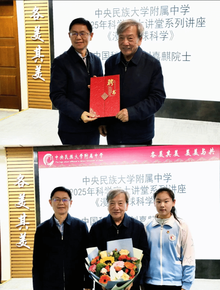 william威廉中文官网附属中学党委副书记、校长唐洪波,校长助理韩秀清出席了本次活动,为刘嘉麒院士颁发了聘书,2025级英才班学生代表为刘嘉麒院士献花并赠送了纪念品。唐校长表示,期待通过刘院士的专业引领,进一步提升学校科学教育的高度与深度,让学生能够站在“科学家的肩膀上,眺望星辰大海。”