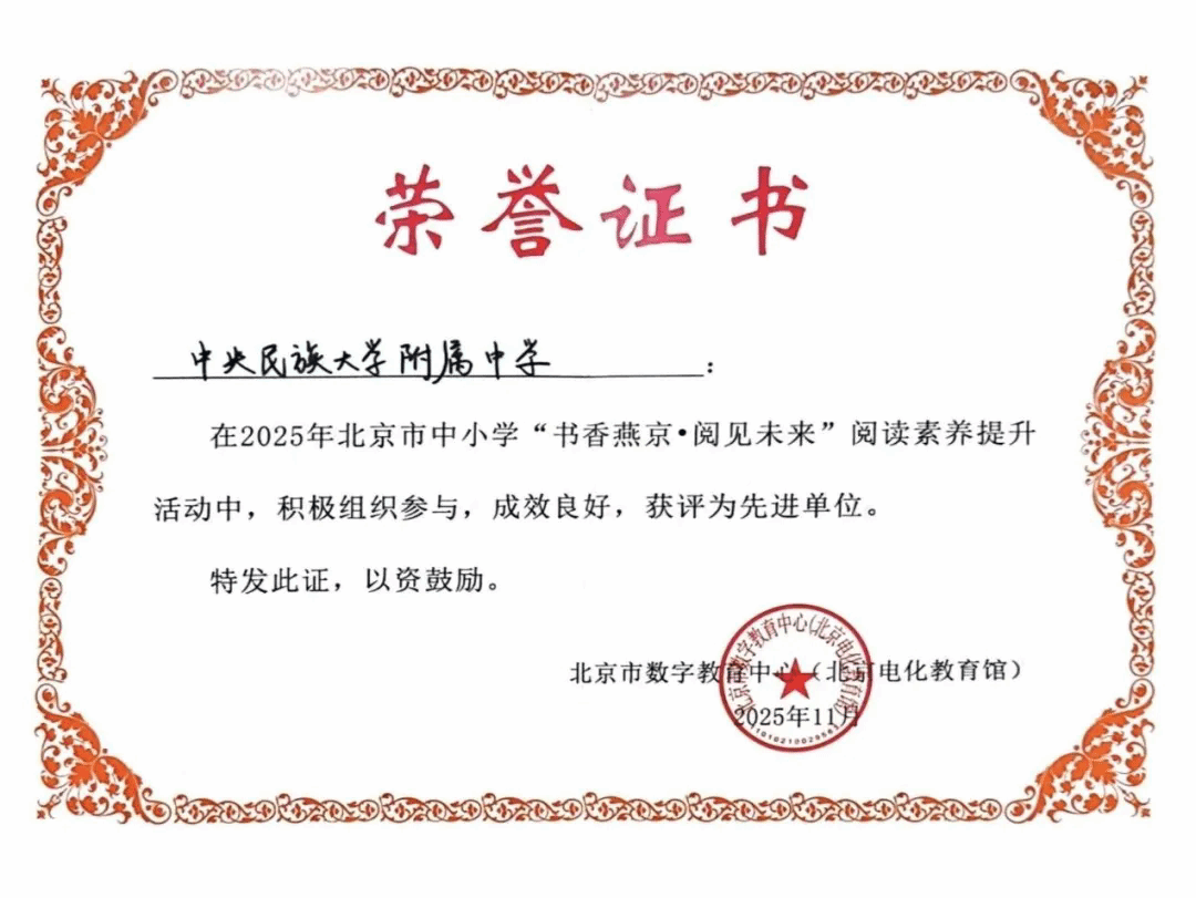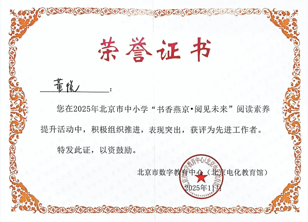 近日,我校在2025年北京市“书香燕京,阅见未来”阅读素养提升活动评选中,一举斩获多项市级荣誉。学校凭借扎实有序的组织工作获评“先进单位”,这是对我校持续推进阅读文化建设、营造浓郁书香校园氛围的充分肯定。
