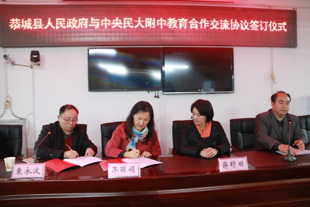 12月28日,我校党委书记佟丽娟一行赴广西恭城瑶族自治县调研,并代表民大附中与广西恭城瑶族自治县副县长蒋舒羽签订教育交流合作协议,民大附中丰台实验学校执行校长刘晓华、桂林市师培中心袁永波、教育局长孟定清等出席签约仪式。