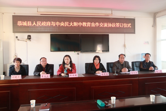 我校党委书记佟丽娟在签约仪式上讲话,她表示民大附中作为全国民族基础教育的领头羊,以“培养民族优秀人才,服务民族基础教育”为新时期办学使命,在学校自身教育教学实力和人才培养能力受到党和国家、社会各界充分肯定的同时,积极引领带动全国民族基础教育的共同进步发展。协议启动后,中央民大附中将从以下几个方面助推恭城县的教育新发展:一、以支教为平台,深化双方的校级合作与交流。二、积极开展学生之间的交流与互动活动。三、共享联盟成员校的优质教育资源。在“共美教育领航,民族教育自强”的旗帜引领下,我校将用民附特有的情怀,共同研究解决恭城教育发展的瓶颈问题,助推恭城教育再铸新辉煌。