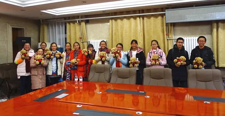 座谈会结束后,参会的老师和同学一道合影留念。王建英老师和高原老师向昆明五华实验学校的老师和同学赠送校服熊作为纪念礼物。