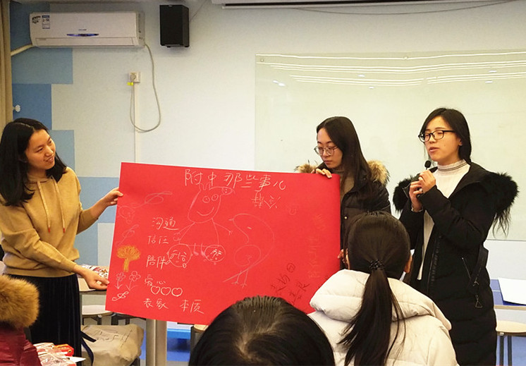 在这个活动的启发下,老师们的交流更加热烈。接着,林亦轩老师请青年教师在一张大的彩纸上,以小组为单位,写下自己在跟学生沟通的过程中产生的关键词,并介绍关键词背后的事件经过。老师们积极讨论,在彩纸上写写画画,接着以小组为单位,汇报讨论结果,分享自己在教育教学过程中所遇到的与学生或家长进行有效沟通的事例:和学生沟通时,他们运用了“叉叉圈叉”教育法、“和煦春风胜秋风”,发现一个善意的玩笑比直言的批评更有效;和家长沟通时,他们体会到进退有度,才能在学生和家长见架起沟通的桥梁。而整个过程中,一定不可缺少的元素就是“爱”,对学生的关爱,对教育的热爱……