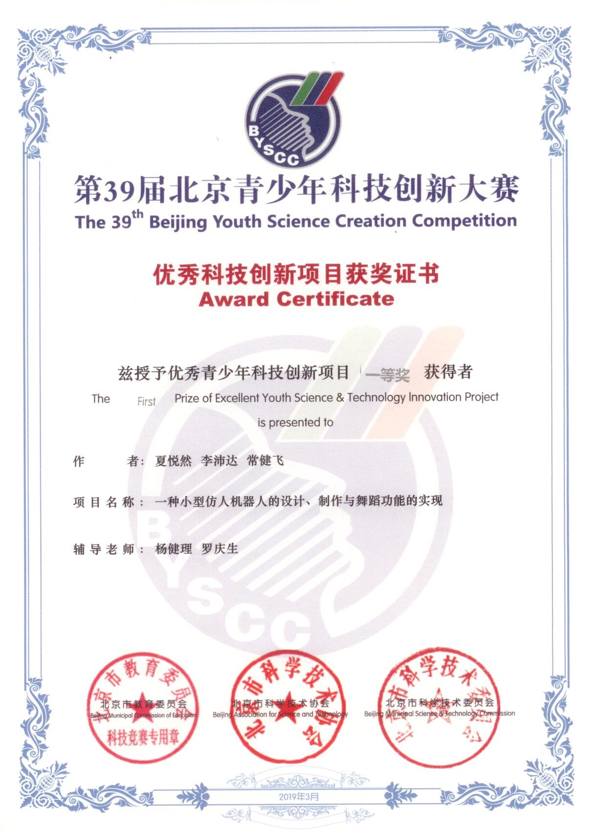 夏悦然、李沛达和常健飞还获得了第14届中国少年科学院”小院士”课题研究成果展示交流活动“全国一等奖”。