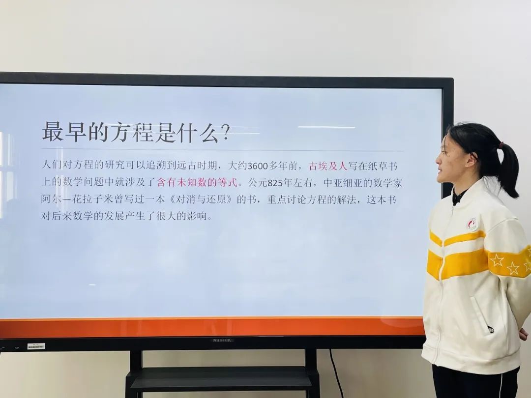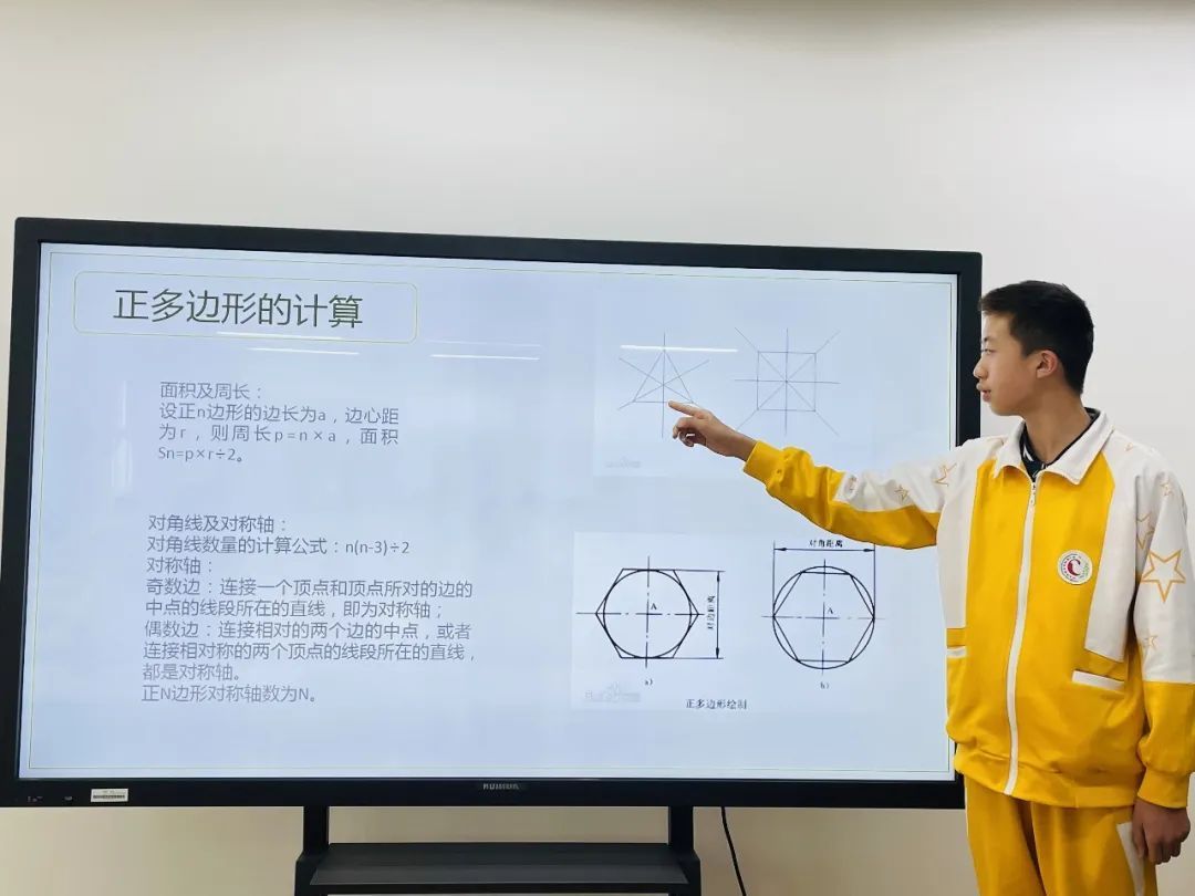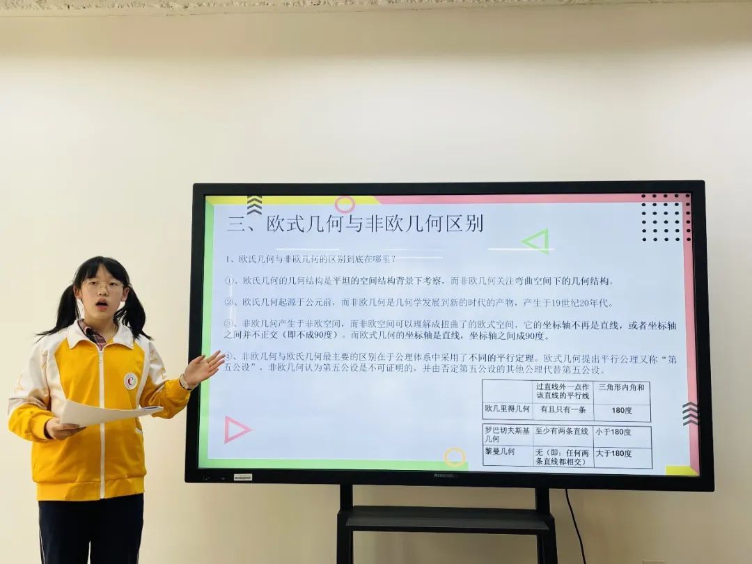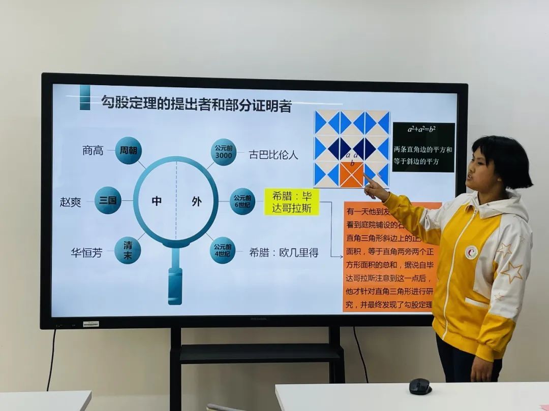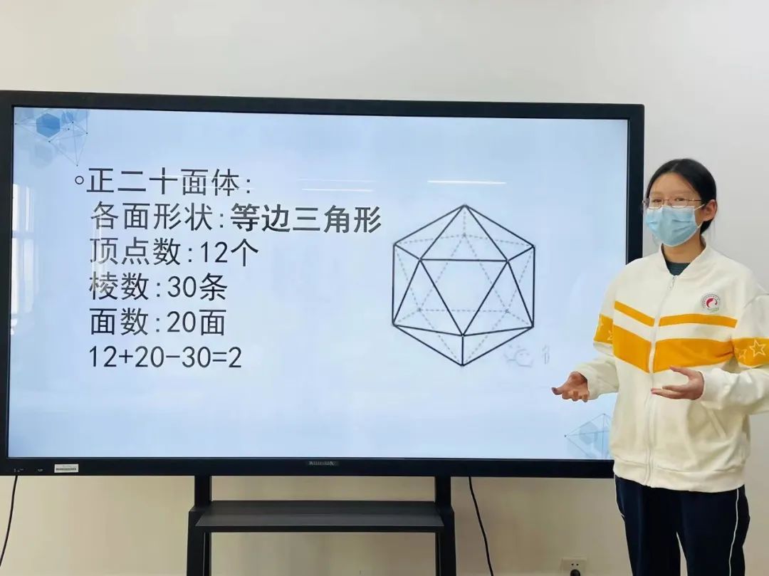 在演讲比赛中,吕鹏辉、周梓禾、陆柯涵、沈玥、王泰然、翟旖诺、谢佩轩、张懿翾、王梓昊9名同学分别向大家分享了“二进制和十六进制的转换”“勾股定理”“二次函数的图象”“正多面体与欧拉公式”“斐波那契数列-发现生活中的美”“方程的起源”“九连环”“正多边形和正多面体在生活中的应用”等故事。
