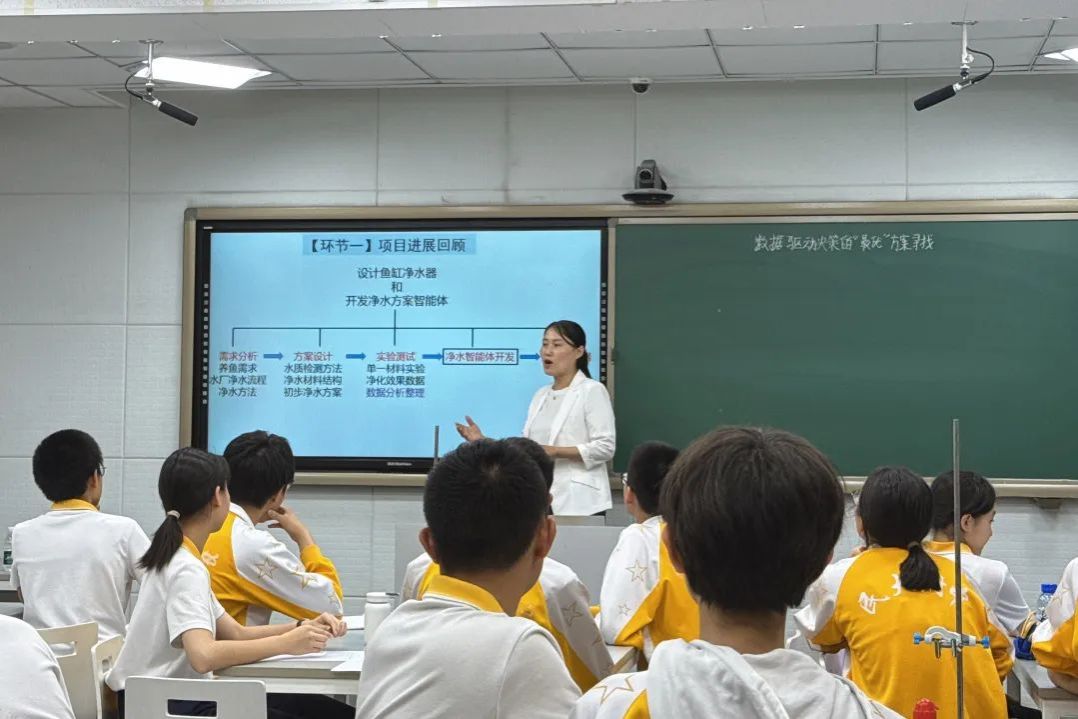 化学教师陈婷婷呈现了《数据驱动决策的最优方案寻找——自制净水器》研究课。课例针对传统净水材料效率测评方法效能不足的痛点,设置界定问题、科学调查、实验探究、设计智能体、反思总结五大子任务,有机整合化学、数学与信息技术学科要素。学生通过多变量控制实验获取数据样本,基于实验数据,学生借助AI技术进行数据建模、函数拟合,开发“水净先知”净水方案智能体,并基于人机协同机制对系统参数实施动态调优。该课例创新性地融合了实验科学与数据科学方法论,有效培育了学生系统性工程思维与智能时代科研素养。