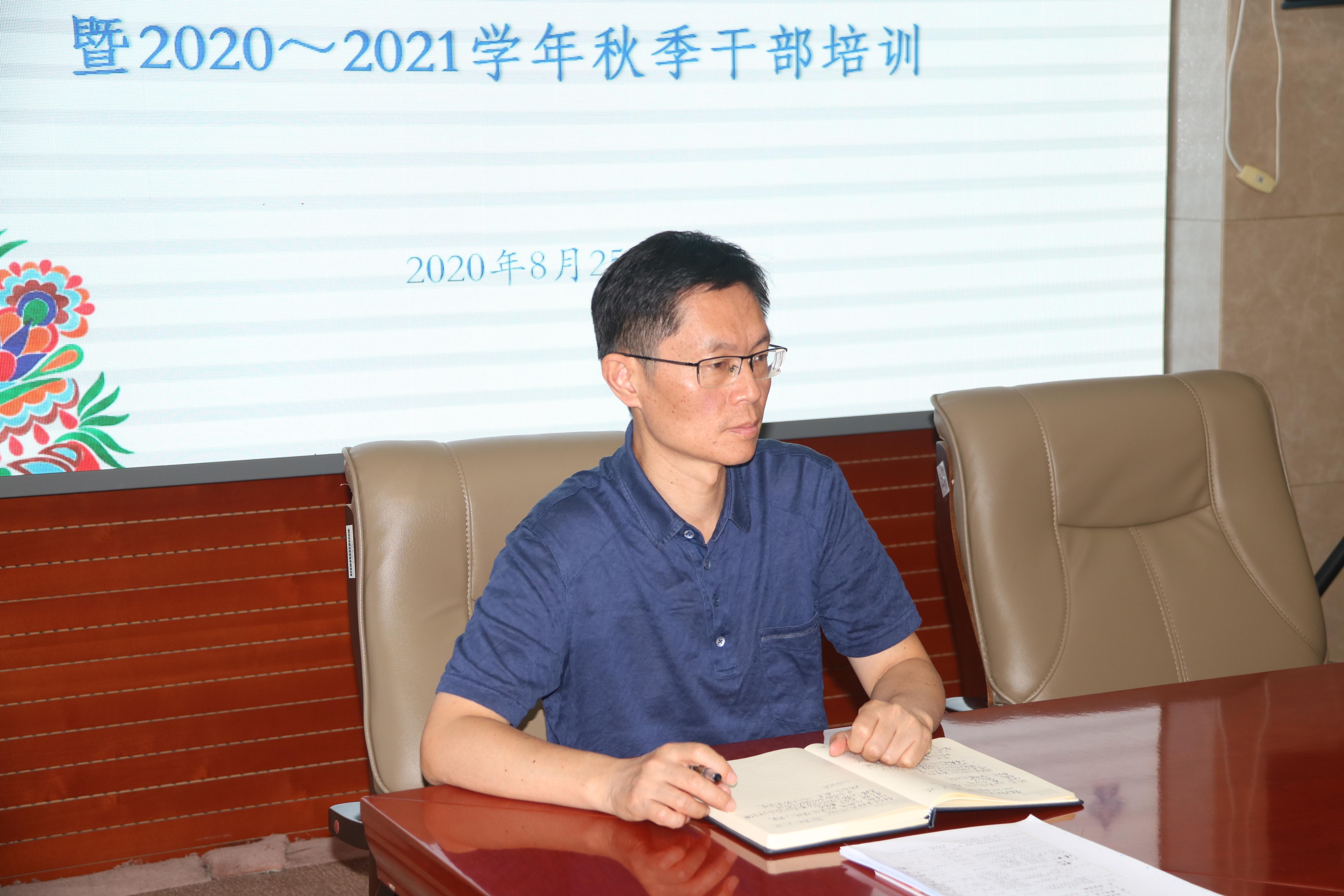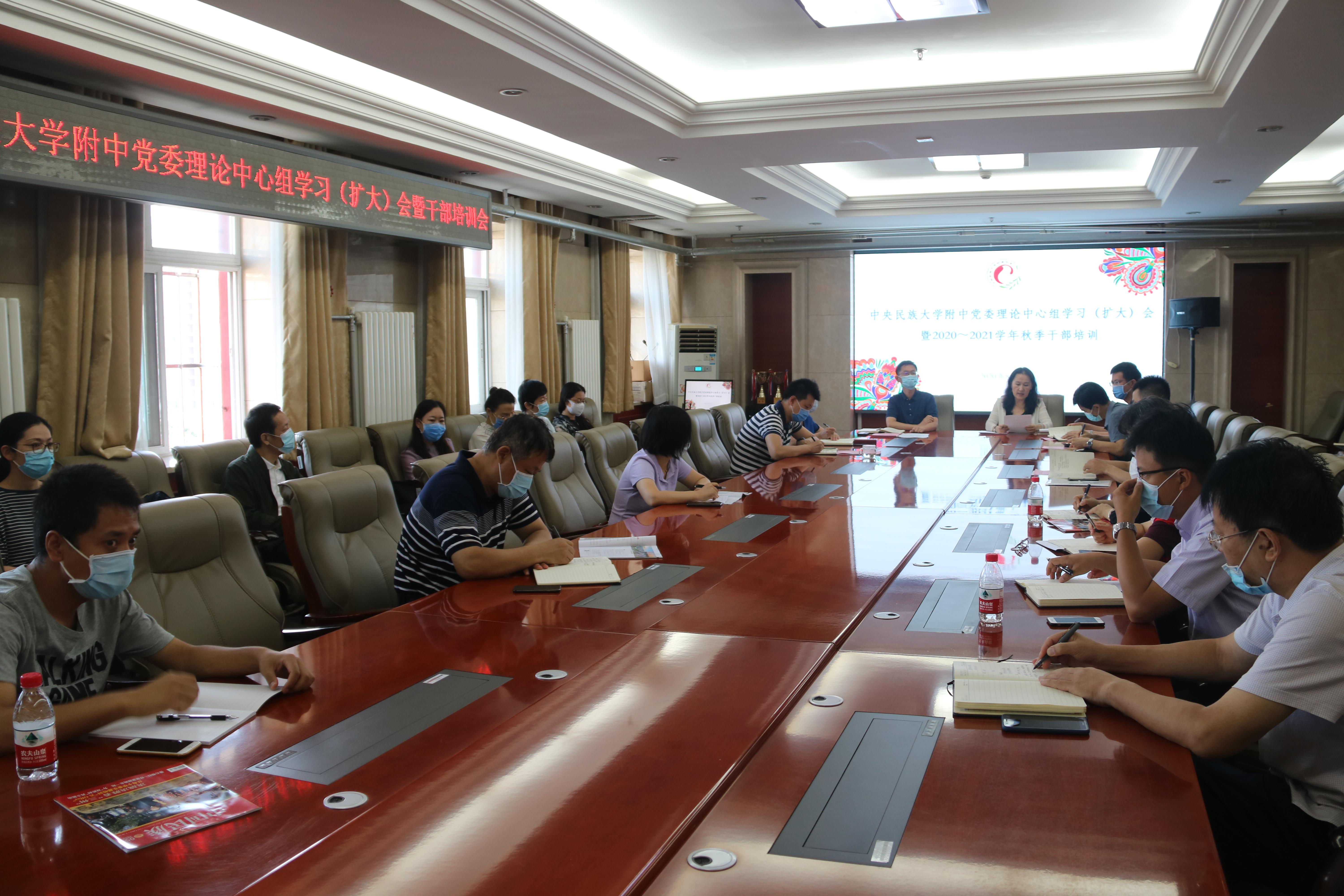 8月25日,william威廉中文官网附中党委理论学习中心组(扩大)学习会暨2020-2021学年秋季学期干部培训会在我校海淀校区八楼会议室召开。中央民大附中党委书记佟丽娟,党委副书记、常务副校长唐洪波等全体校领导、中层干部、年级主任、党支部委员、学科组长参加了培训会。会议由唐洪波主持。