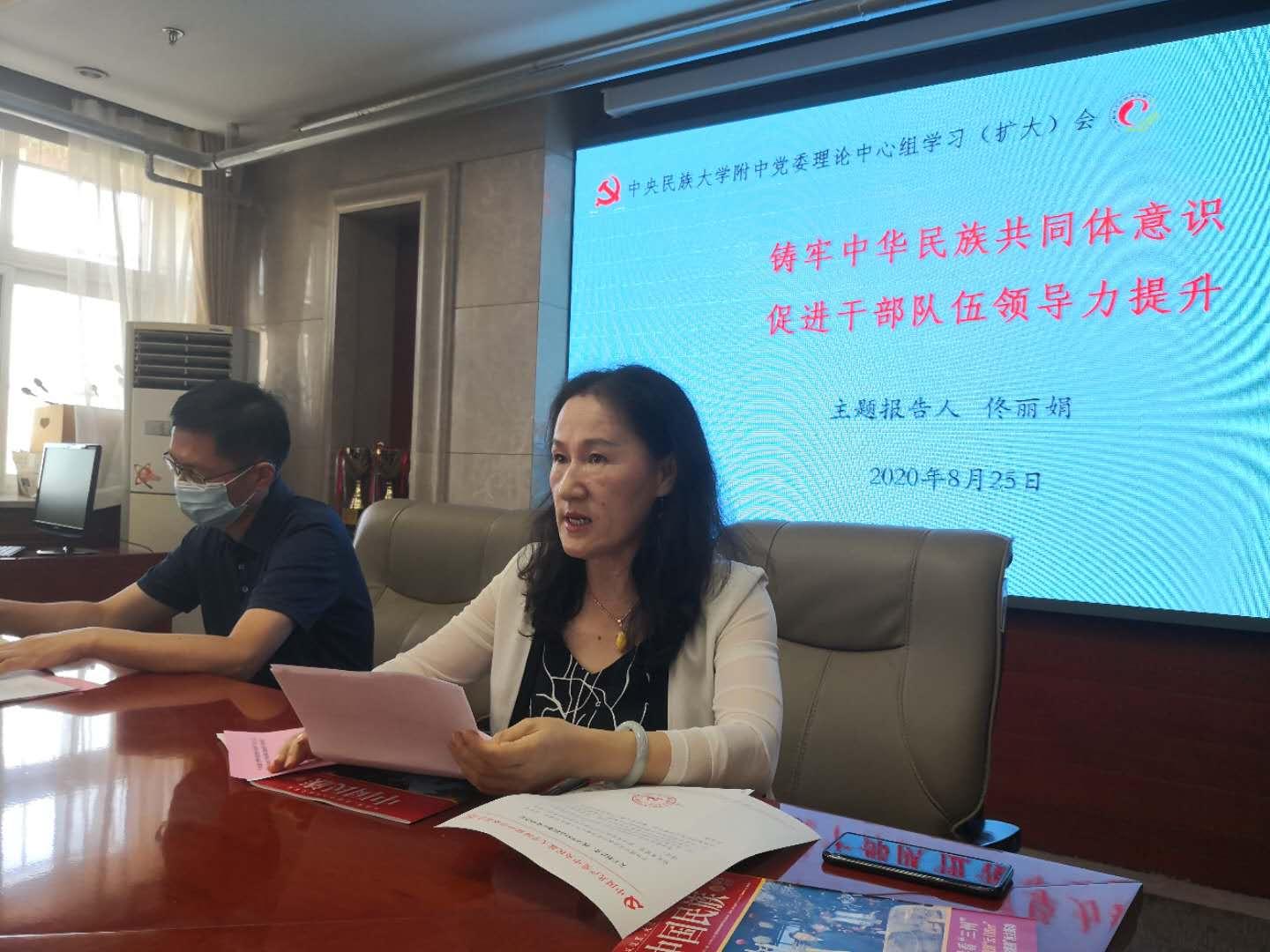 佟丽娟书记首先宣布了新学期部分干部调整的任命、此次干部培训的思路目标。在党委理论中学组学习(扩大)会上,佟丽娟书记作了《铸牢中华民族共同体意识 促进干部队伍领导力提升》的主题报告。她首先介绍了习近平总书记站在历史和时代的高度提出“铸牢中华民族共同体意识”这一伟大命题的背景。铸牢中华民族共同体意识作为习近平新时代中国特色社会主义思想的重要内容写入党章,成为全党的共同意志和基本遵循。中华民族共同体意识是国家统一之基、民族团结之本、精神力量之魂。