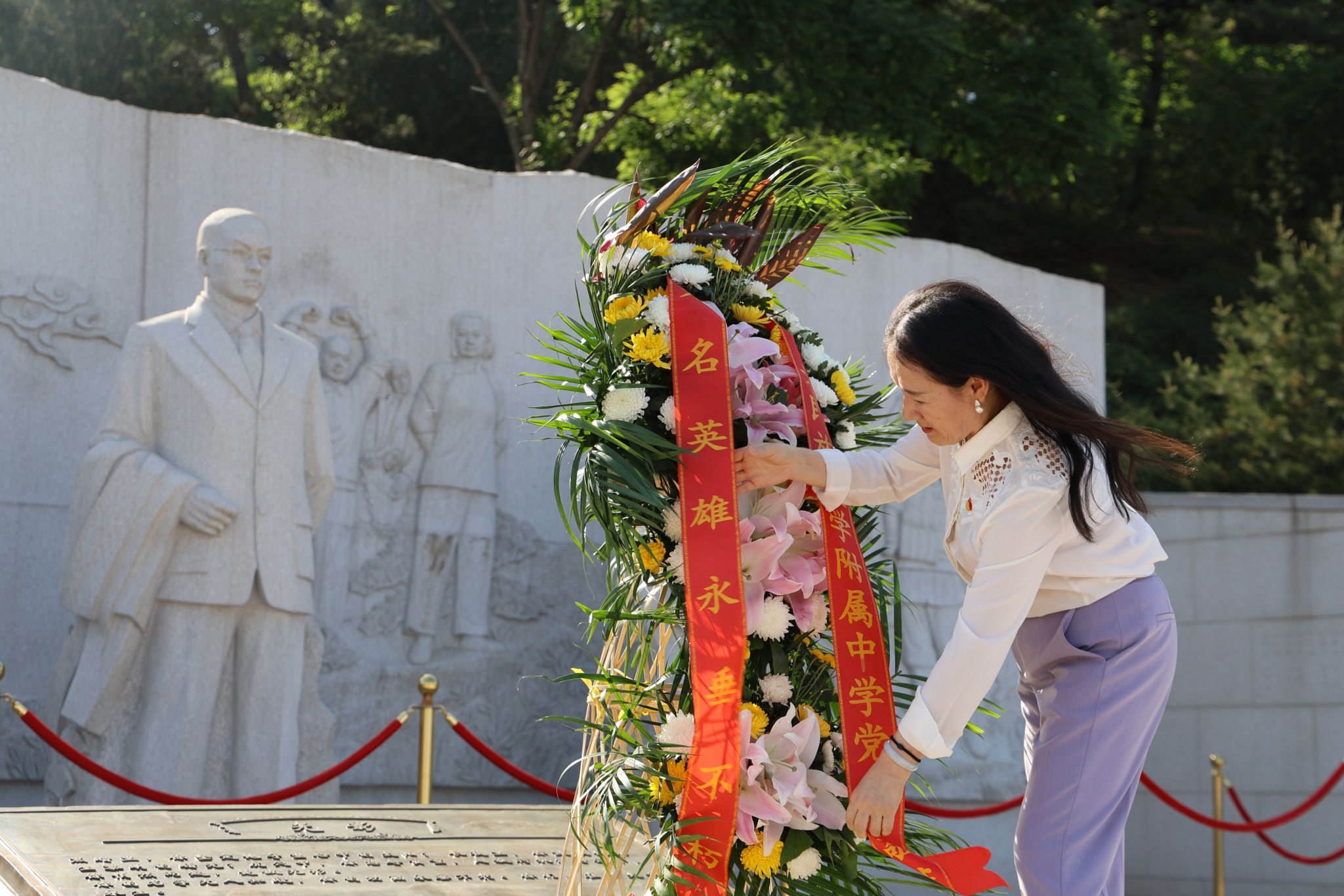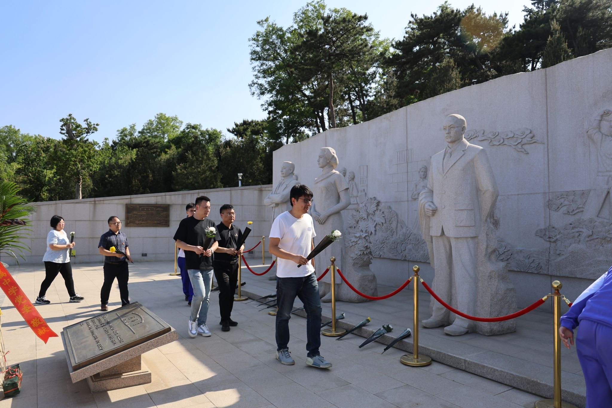 2021级教师党支部书记赵维和老师和学生代表为烈士敬献花篮,党员、积极分子、学生依次向烈士雕像敬献鲜花,缅怀为国家统一和民族解放事业献身的革命先烈。