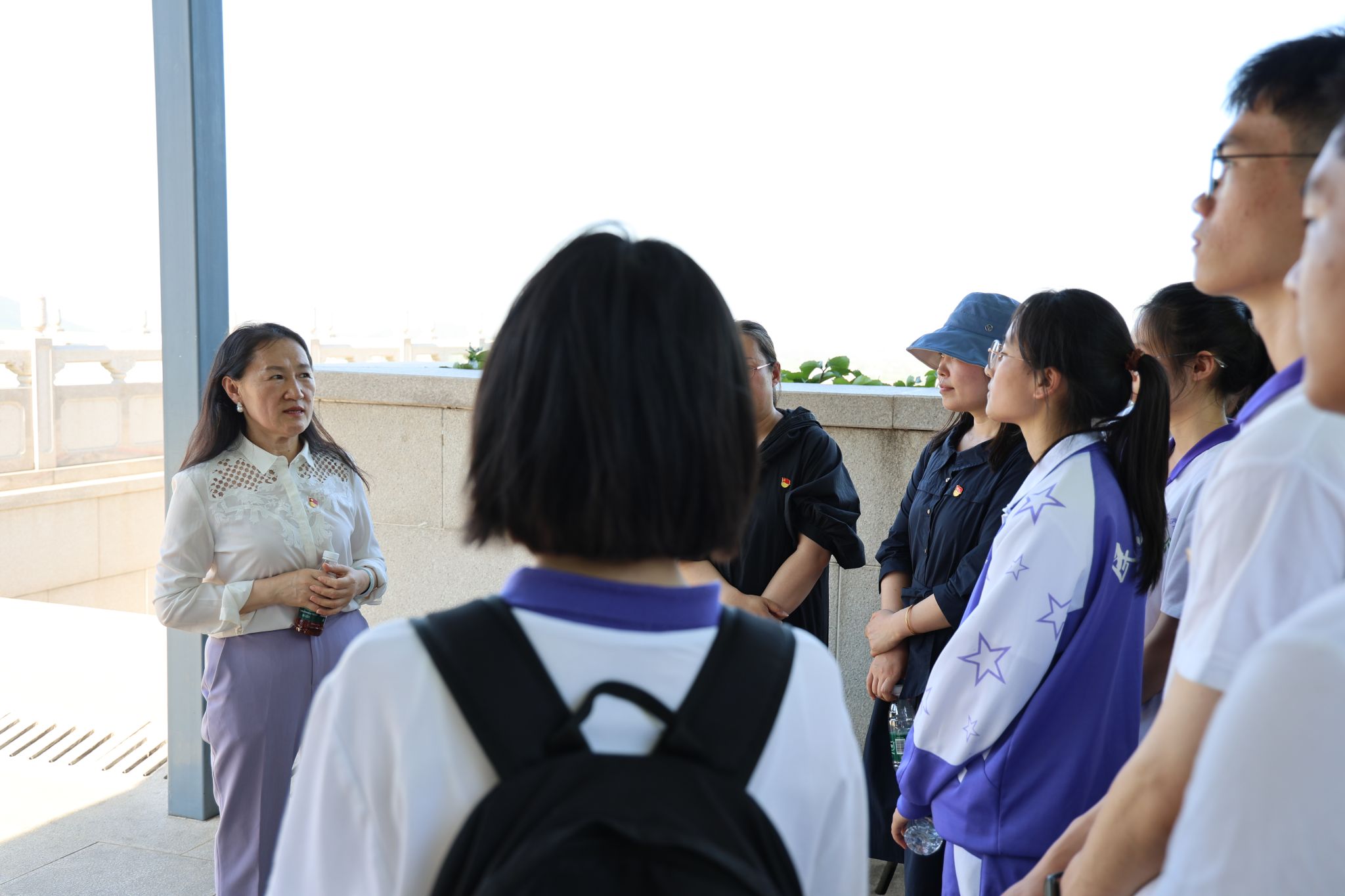 无名英雄纪念广场迎面以黑白两色曲线隐喻海峡两岸,巨幅景观墙中有毛泽东主席题诗:“惊涛拍孤岛,碧波映天晓。虎穴藏忠魂,曙光迎来早”。沿着景观墙左右台阶拾级而上,两边的花岗岩墙壁上刻着到目前为止、经各方查找发现的846位当年牺牲于台湾的烈士英名。名字以阴文素镌,若隐若现,既暗合了隐蔽战线的斗争特质,也彰显其淡泊名利的高尚品格。广场上设置了“忠魂”“光影”“家国”“信义”“追梦”等5块铭文碑。师生们认真聆听了以吴石、陈宝仓、朱枫、聂曦四位功勋为代表的二十世纪五十年代牺牲于台湾的中国共产党隐蔽战线无名英雄的英雄事迹。