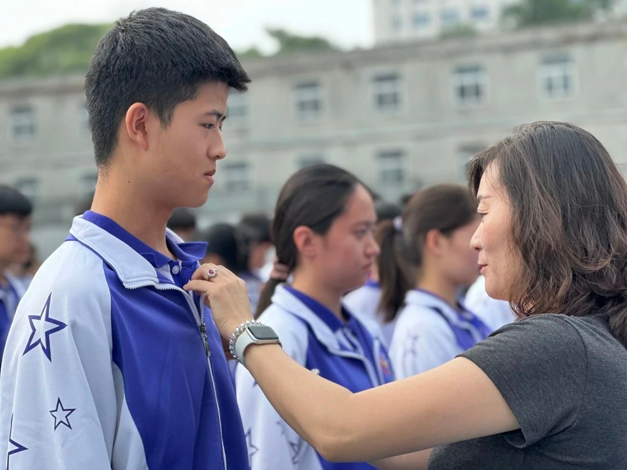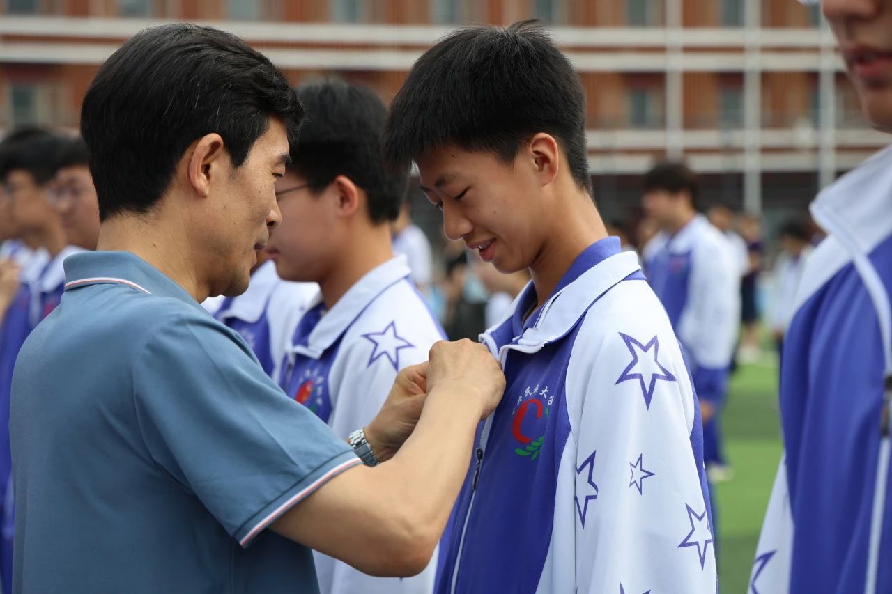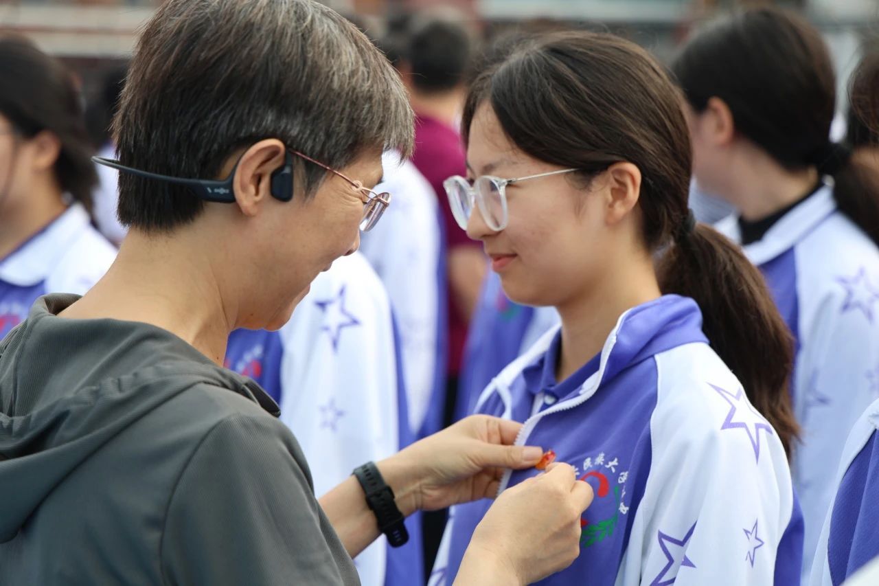 校领导、年级主任、班主任老师为新团员佩戴团徽。一枚枚闪耀的团徽,不仅象征着责任与荣誉,更时刻督促着团员们严格要求自己,用实际行动诠释新时代青年担当。