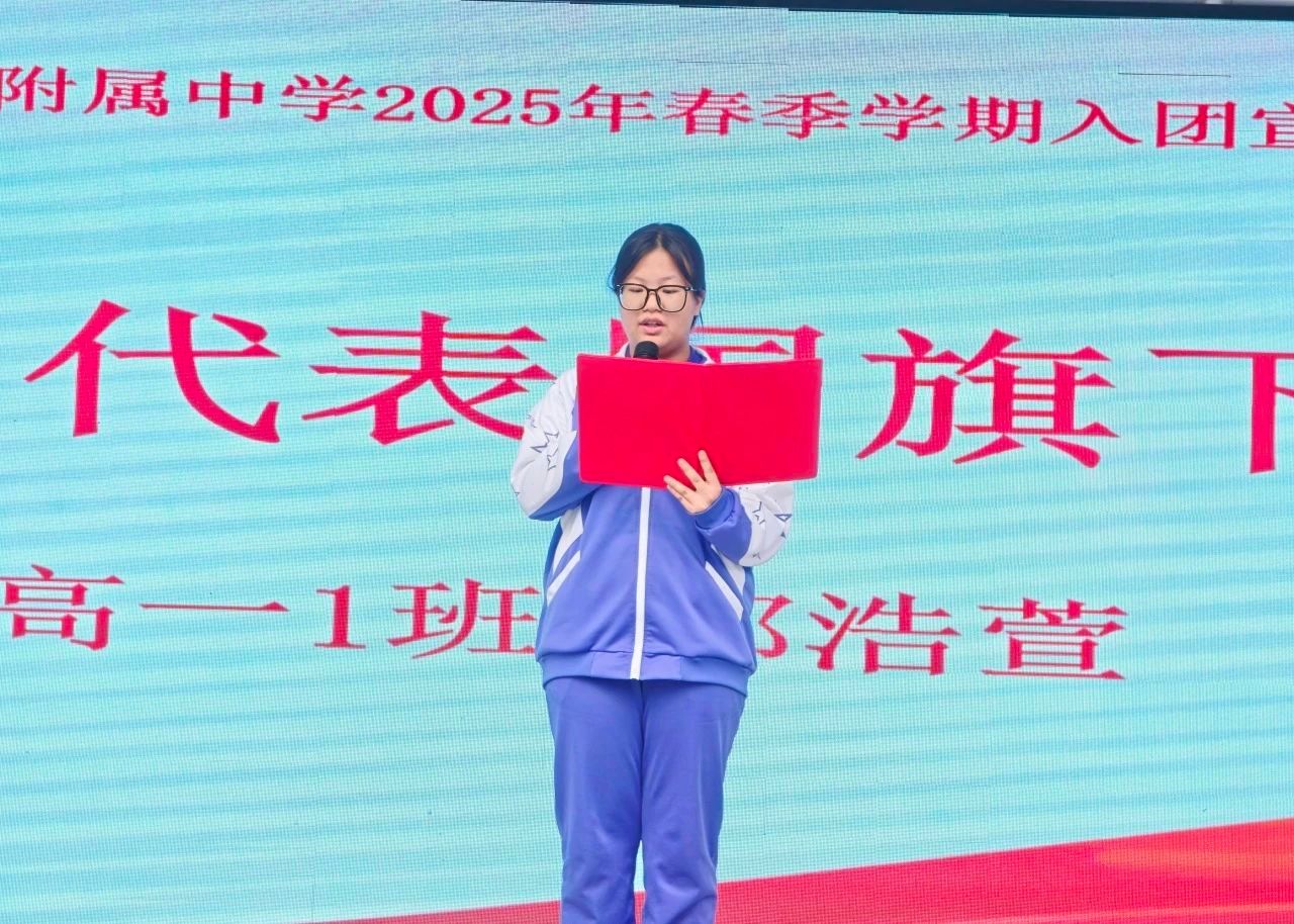 高一(1)班郑浩萱同学作为老团员代表发言。她回顾了在“青马工程”培训班的学习经历,聆听佟书记讲述民附人与祖国共奋进的故事、学习志愿服务精神、与青年榜样面对面、走进中央团校学习百年青年运动史等内容,深刻理解共青团员的光荣与责任,认识到个人理想应融入国家和民族发展。她还分享了参加北京市海淀区第二十七期中学生业余党校的学习体会,课堂上回溯嘉兴南湖红船历史、细读李大钊誓言,感悟到入团是对崇高理想的追求。她希望团员们不忘入团初心,以团旗为引领,用刻苦钻研和奋勇拼搏诠释担当,让青春在实现中国梦的实践中绽放绚丽光彩。