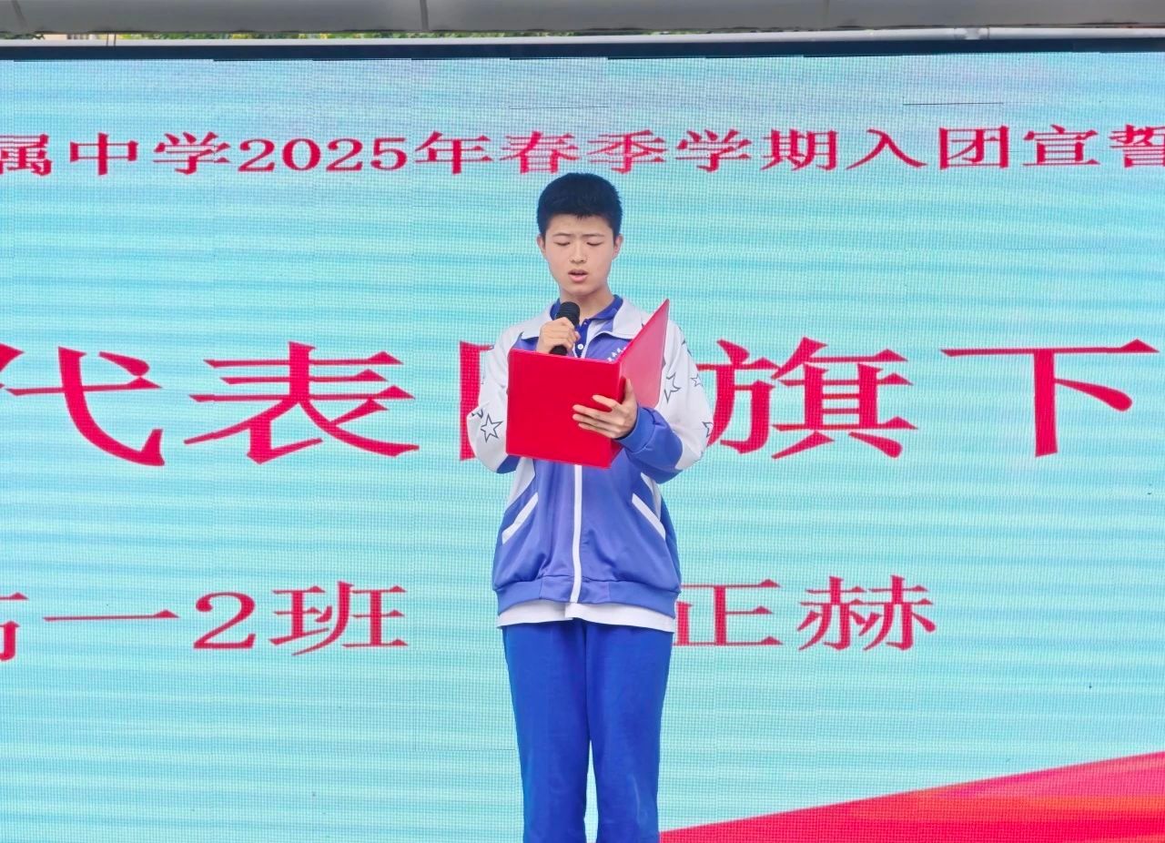 高一(2)班冯正赫同学作为新团员代表发言。他首先表达了加入共青团的荣幸与自豪,指出这既是个人成长的重要里程碑,更是肩负党和国家使命的新起点。他深知共青团是党的助手和后备军,有着光荣历史,无数优秀青年在团的引领下为国家和人民贡献力量。作为新团员,仍需对标先进、补足短板,在团组织培养、老师教诲和老团员帮助下,加倍努力、虚心学习,用实际行动践行入团誓言,在民族复兴征程中书写新时代青年的奋斗答卷。