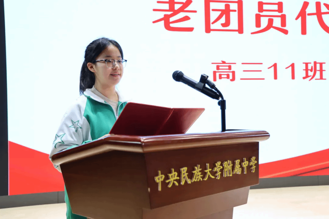 朝阳校区高三11班谭雨晰同学代表老团员发言。她提到,民大附中前身蒙藏学校,曾是早期中国共产党传播马克思主义、培育少数民族革命骨干的重要阵地,校园深处的红色基因,让此次入团仪式更具特殊意义。她呼吁新团员们传承红色基因,以团徽为荣耀、以誓言为指引,将个人 “小我” 融入祖国 “大我”,在青春赛道上砥砺奋进,为民族复兴注入无愧于时代的青春力量。