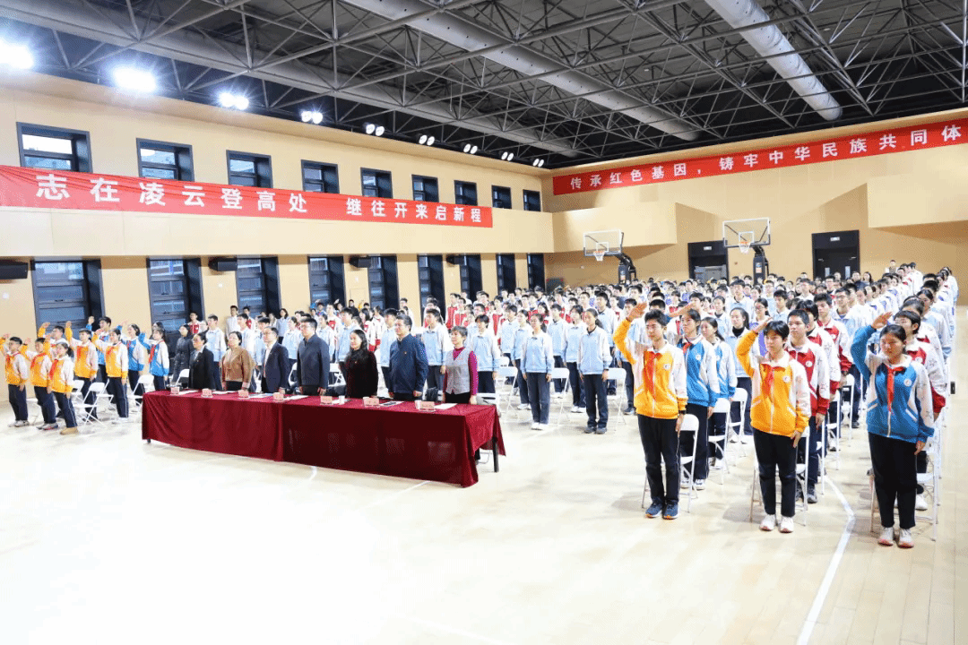 与会领导、老师与老团员代表为新团员颁发团章、佩戴团徽。这枚团徽,是荣誉的见证,是责任的烙印,更是青春的召唤,指引着学子们将红色基因融入青春轨迹,用实际行动传承先辈精神。