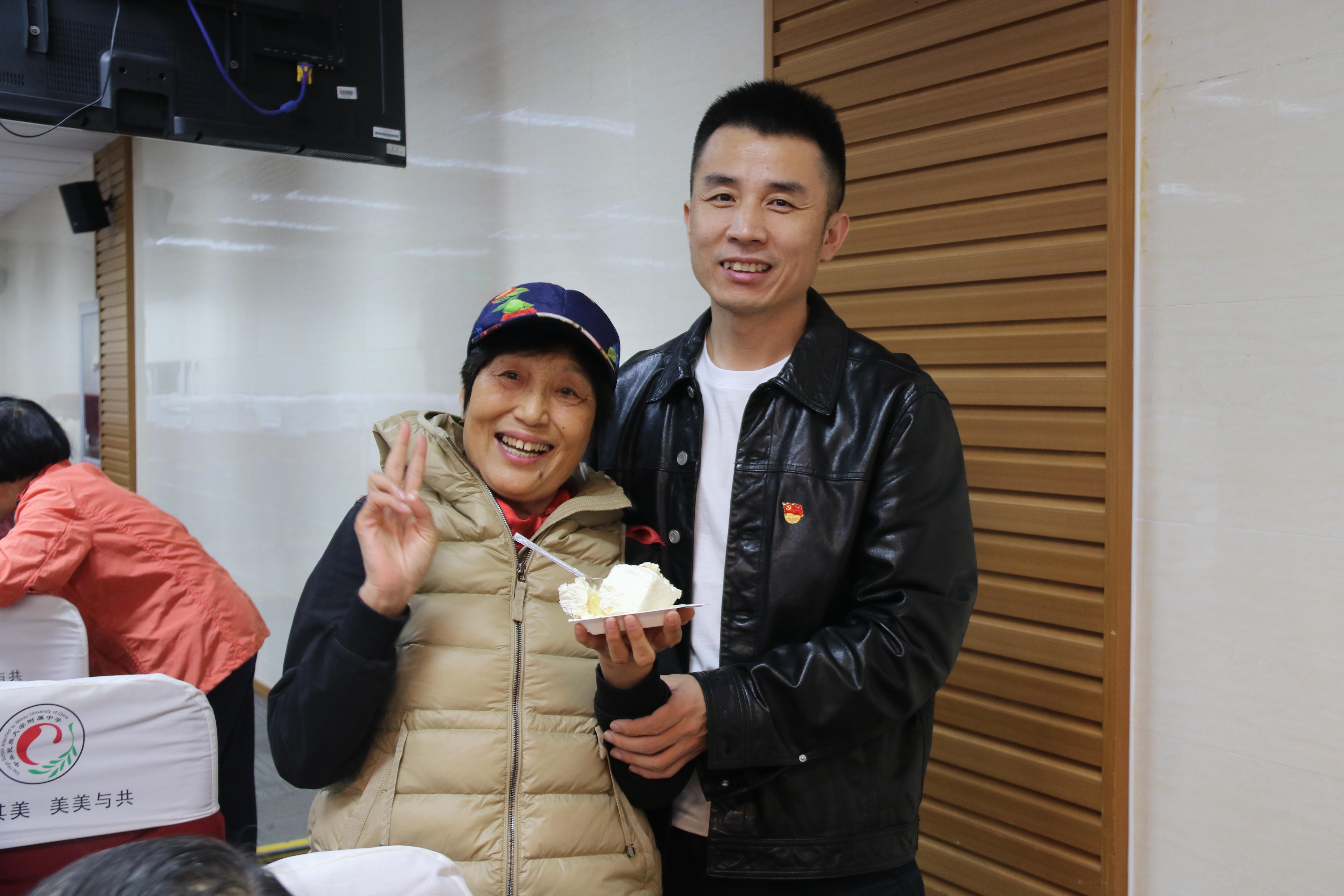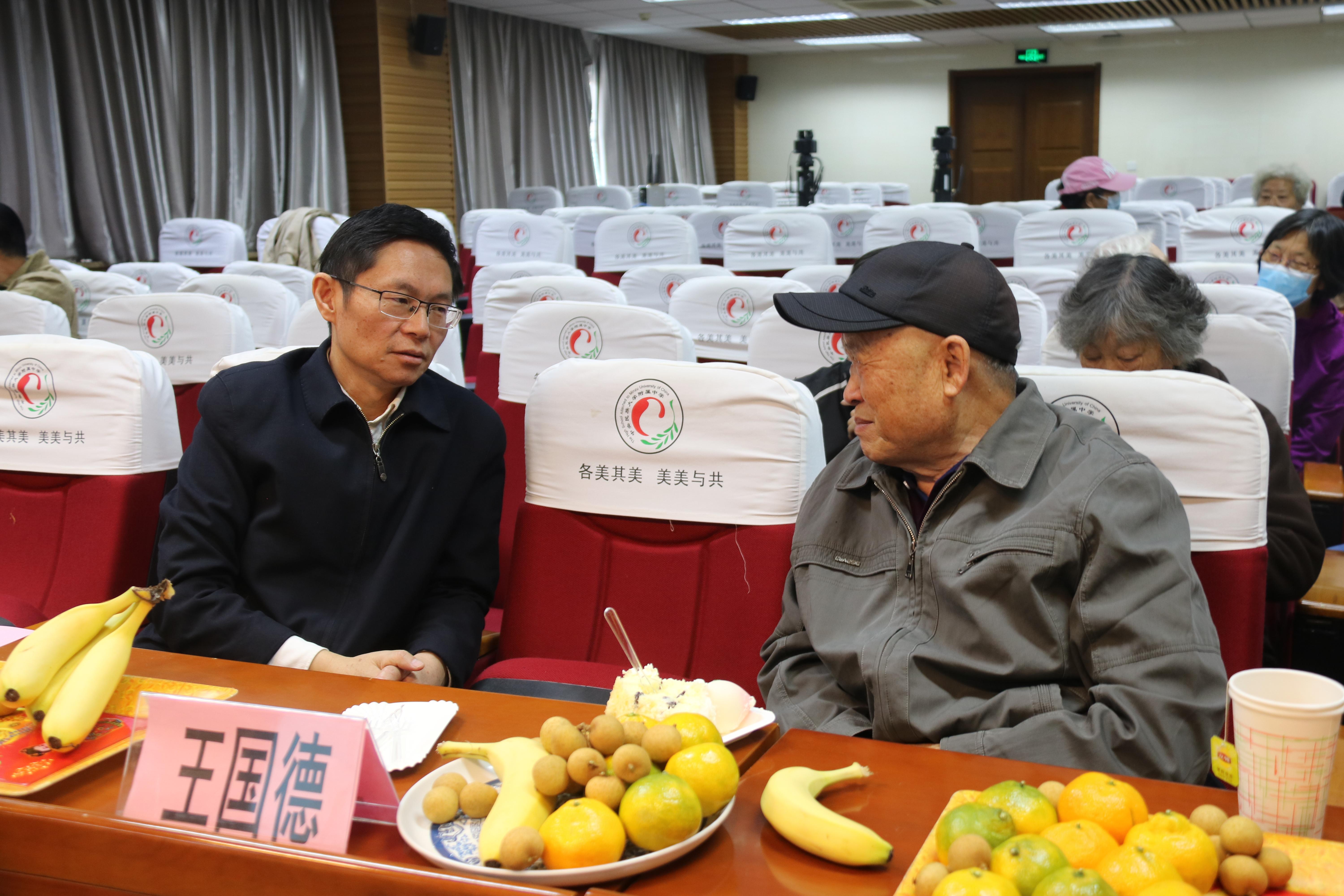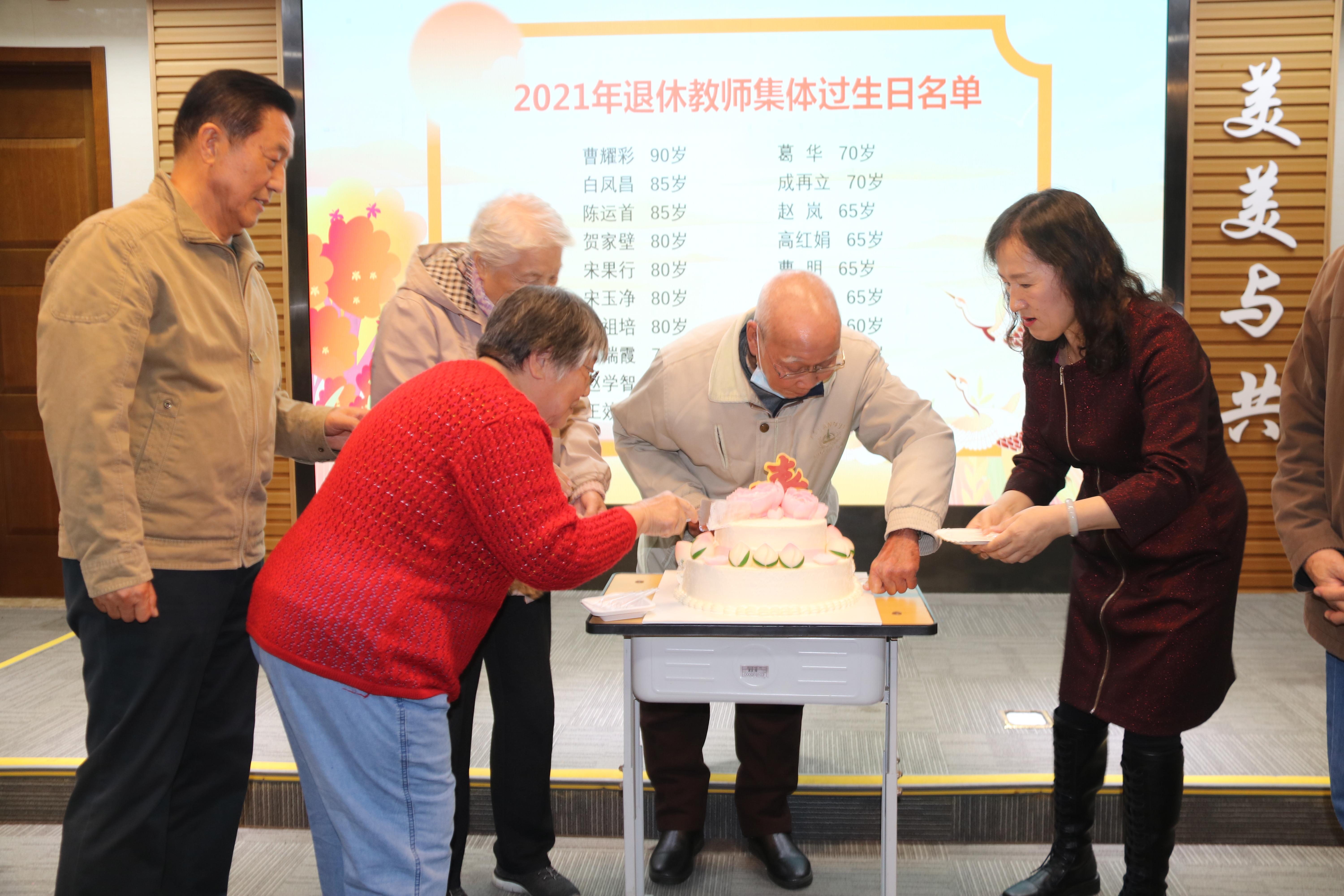庆祝活动中为“逢十逢五”的退休教师集体庆生,学校领导仔细询问他们的身体情况和生活现状,并与过生日的教师们共同点蜡烛、切蛋糕,表达真挚的问候和祝福,同时送上生日礼物,场面温馨感人。