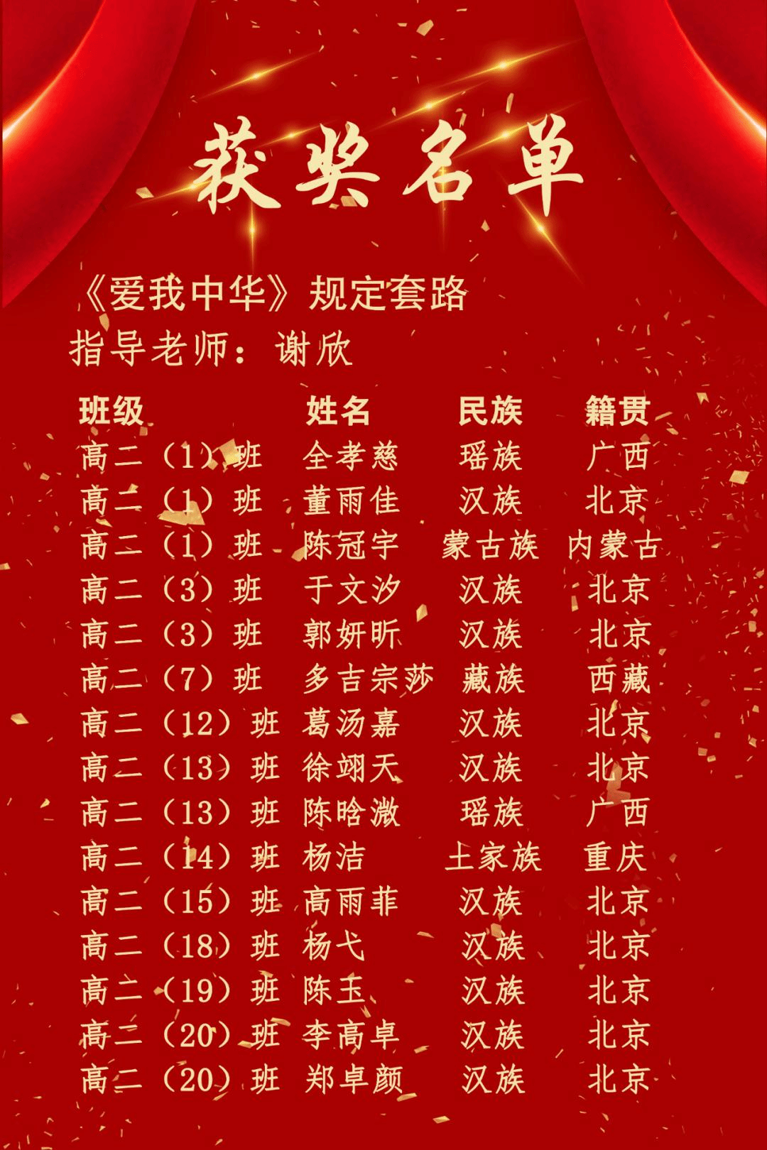 由我校谢欣老师指导,高二年级学生参加的作品《爱我中华》展演。