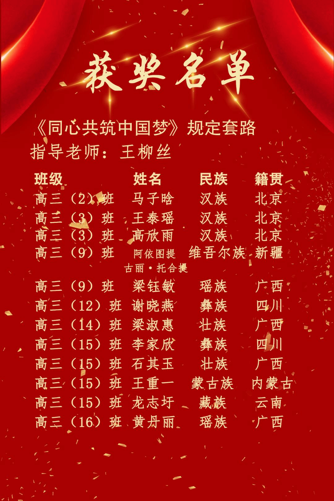 由我校王柳丝老师指导,高三年级学生参加的作品《同心共筑中国梦》展演